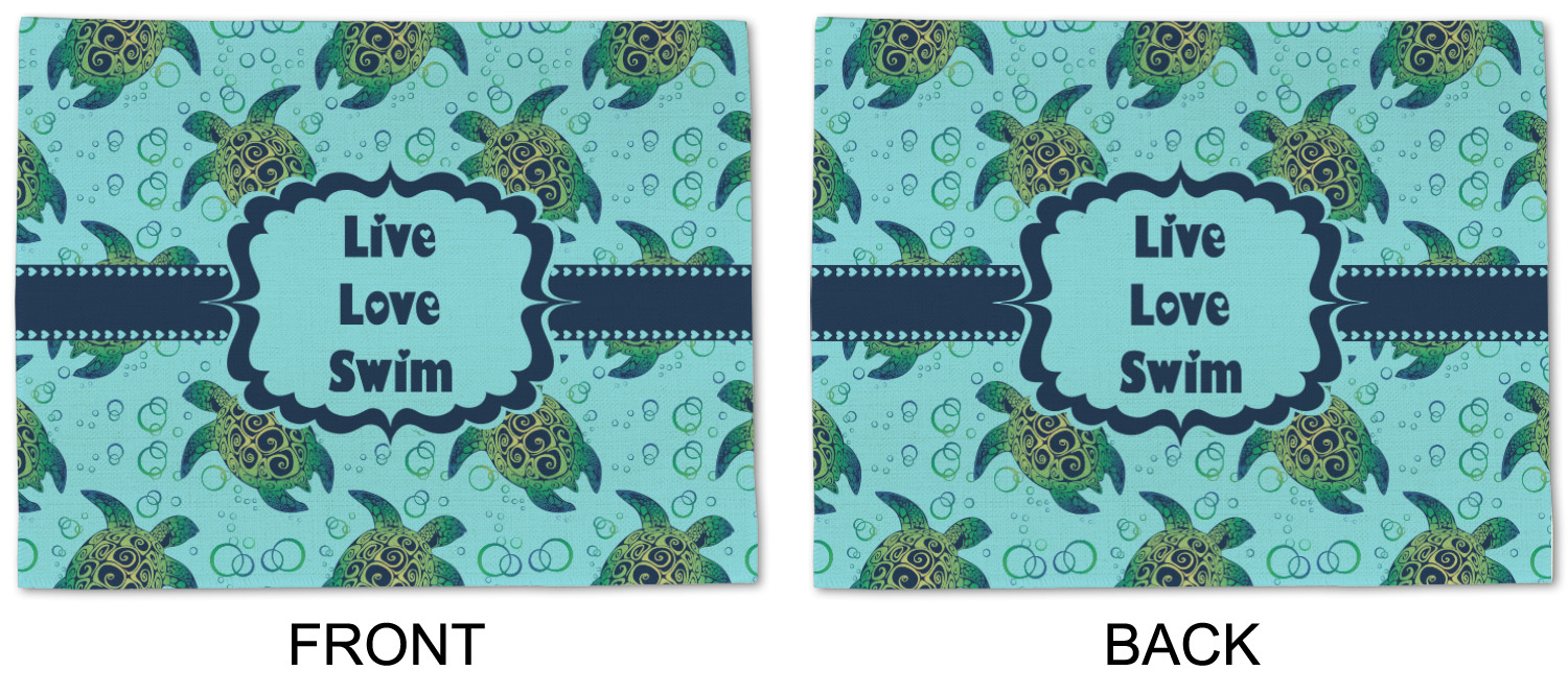 We chose a calming teal for the entire background, navy blue for the turtles background color along with a navy blue ribbon and label. We chose the hearts ribbon, a fancy label and live, love swim for personalization in the hearts font