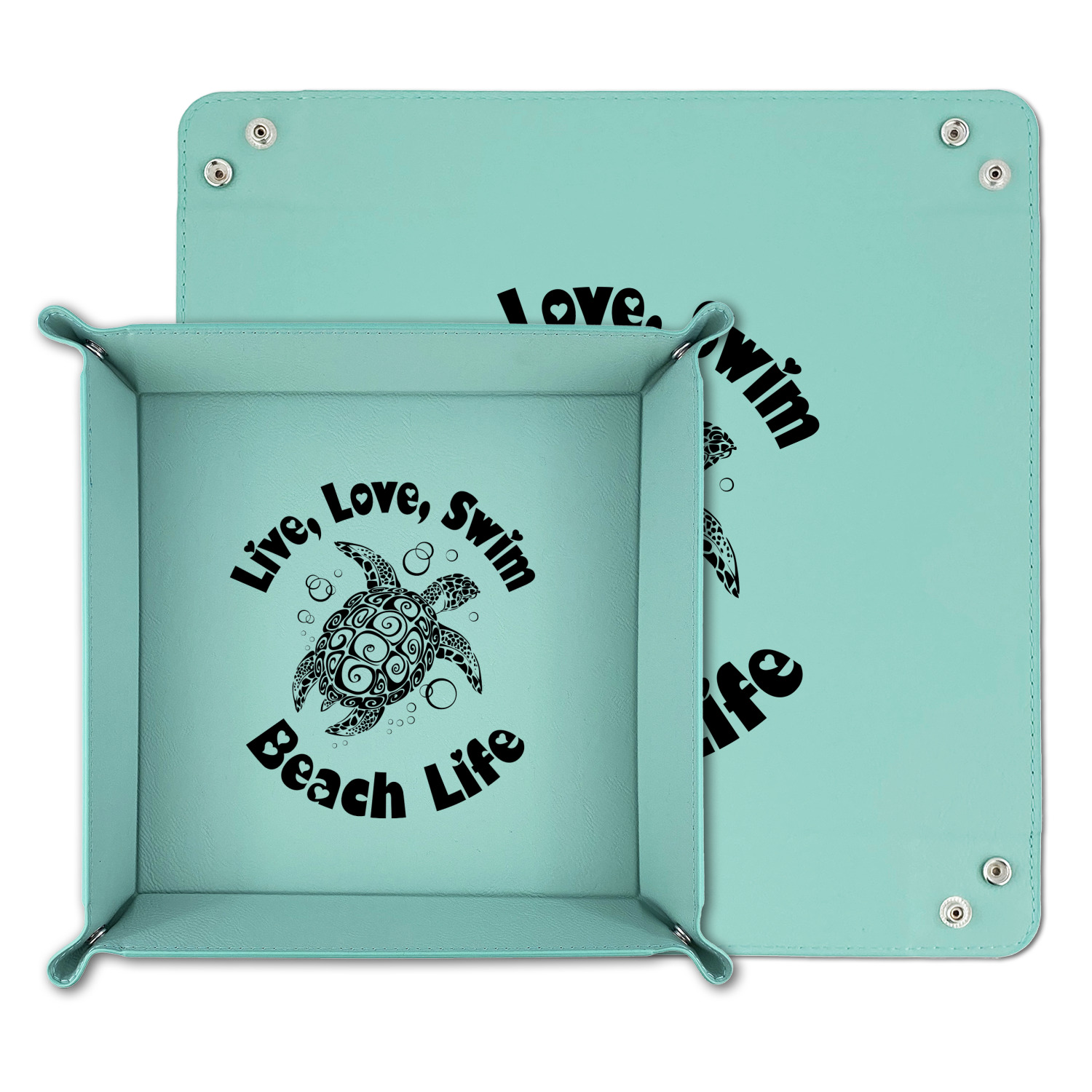 We chose a calming teal for the entire background, navy blue for the turtles background color along with a navy blue ribbon and label. We chose the hearts ribbon, a fancy label and live, love swim for personalization in the hearts font