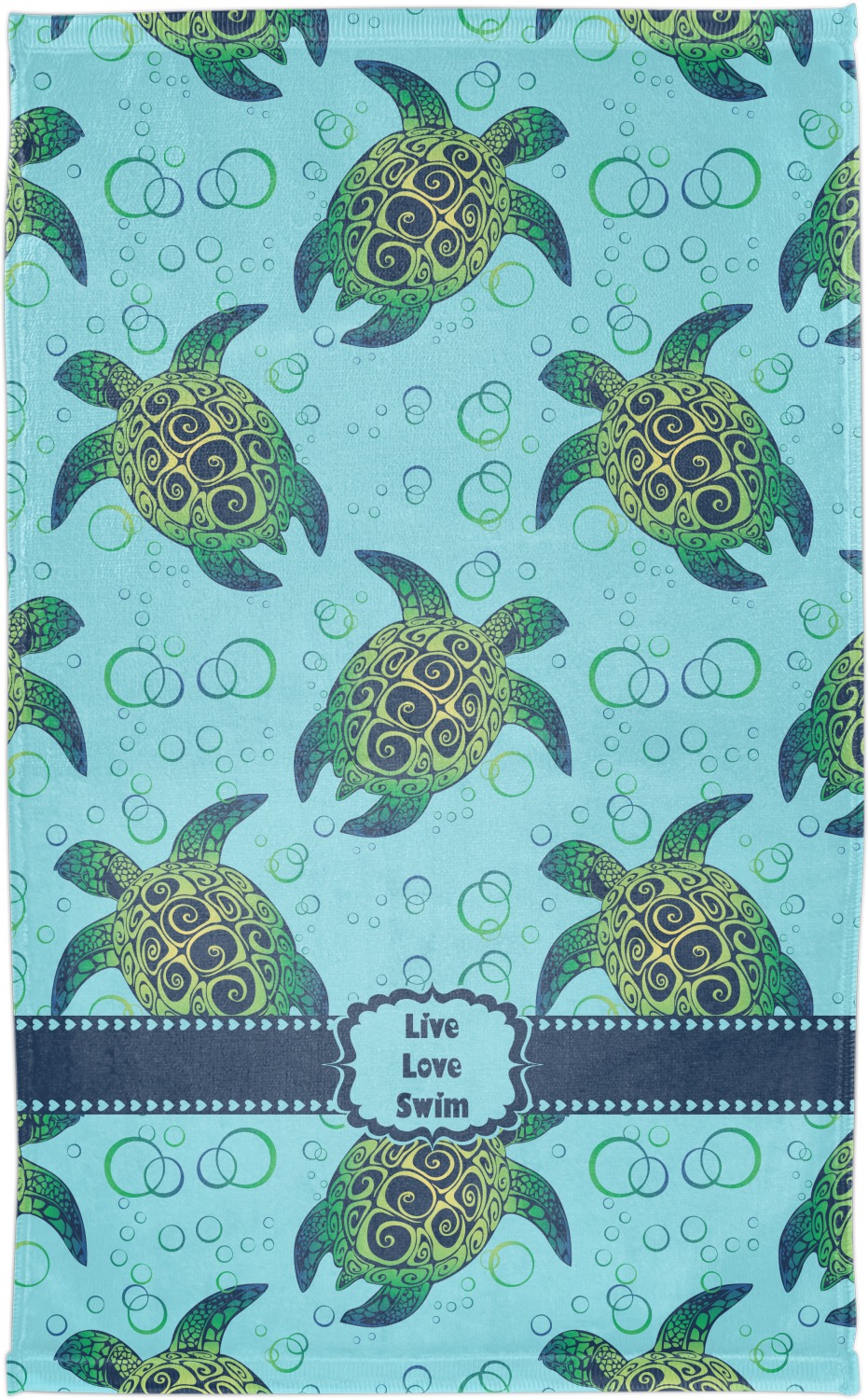 We chose a calming teal for the entire background, navy blue for the turtles background color along with a navy blue ribbon and label. We chose the hearts ribbon, a fancy label and live, love swim for personalization in the hearts font
