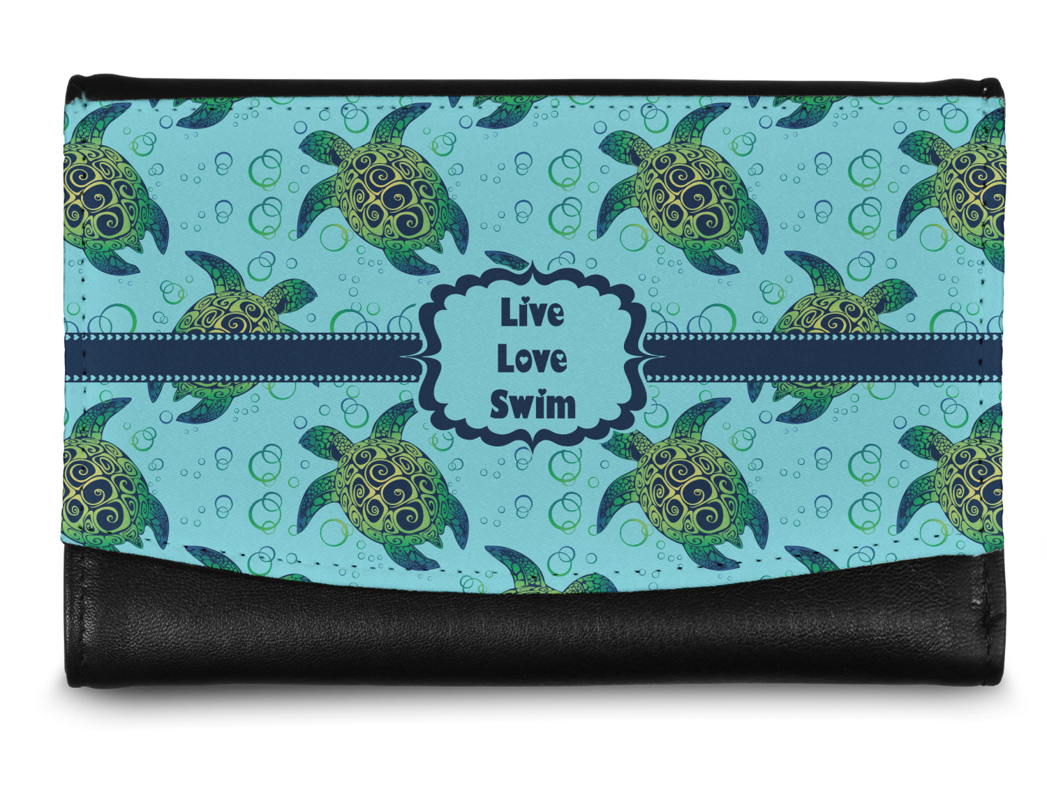 We chose a calming teal for the entire background, navy blue for the turtles background color along with a navy blue ribbon and label. We chose the hearts ribbon, a fancy label and live, love swim for personalization in the hearts font