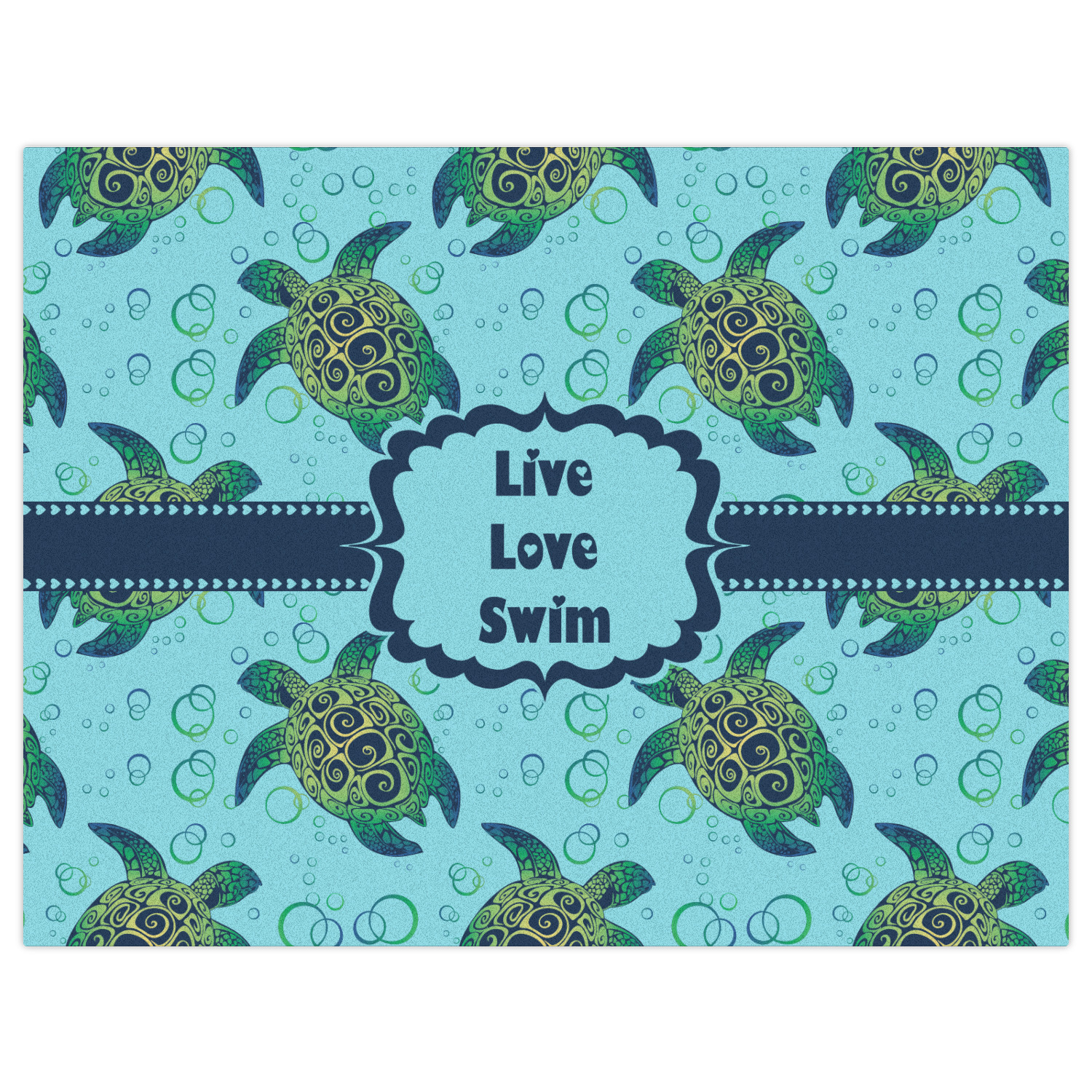 We chose a calming teal for the entire background, navy blue for the turtles background color along with a navy blue ribbon and label. We chose the hearts ribbon, a fancy label and live, love swim for personalization in the hearts font