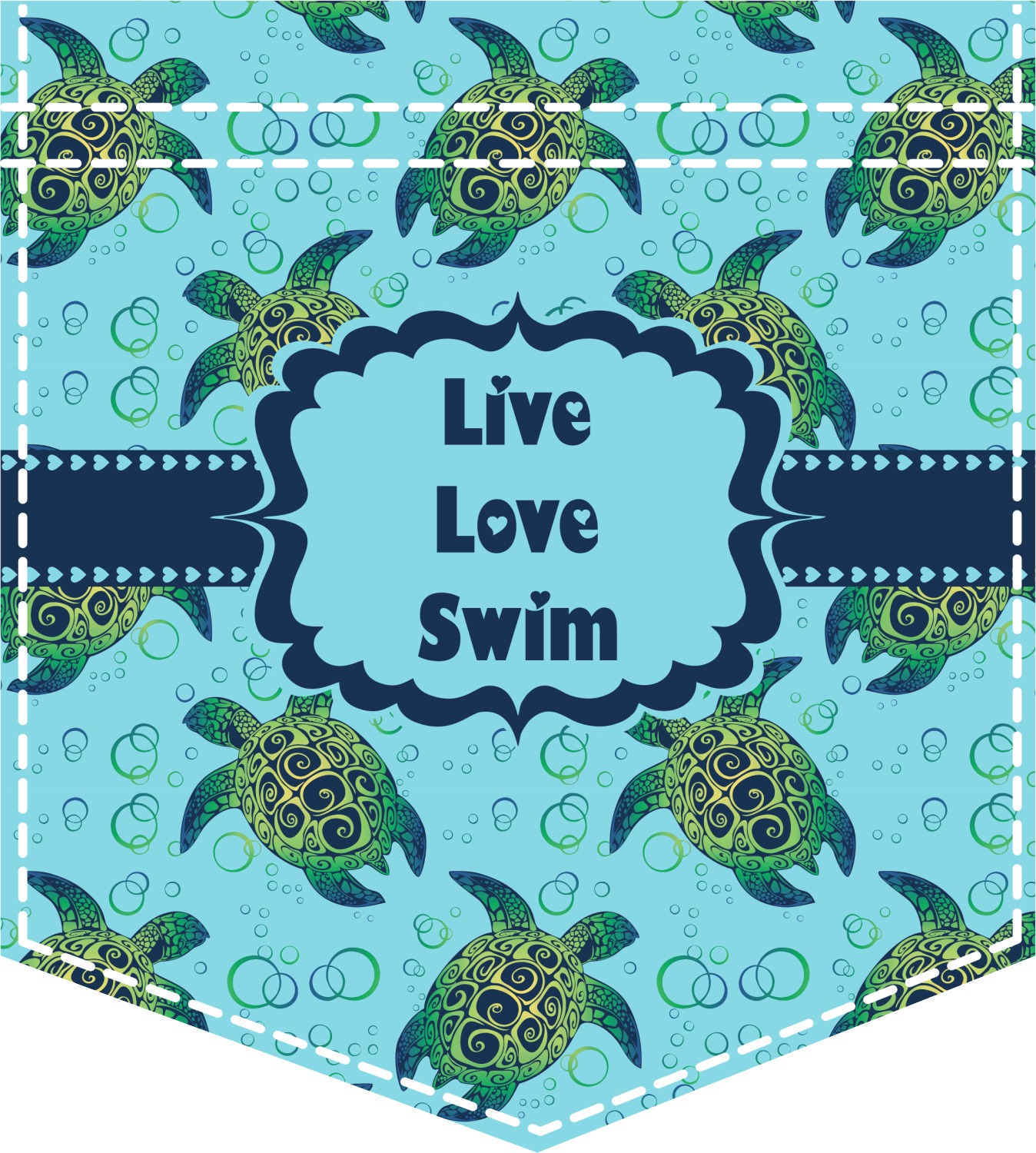 We chose a calming teal for the entire background, navy blue for the turtles background color along with a navy blue ribbon and label. We chose the hearts ribbon, a fancy label and live, love swim for personalization in the hearts font