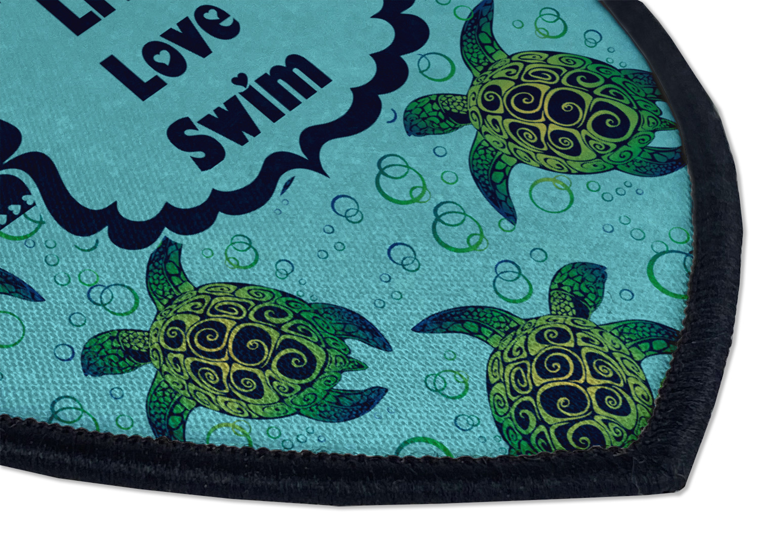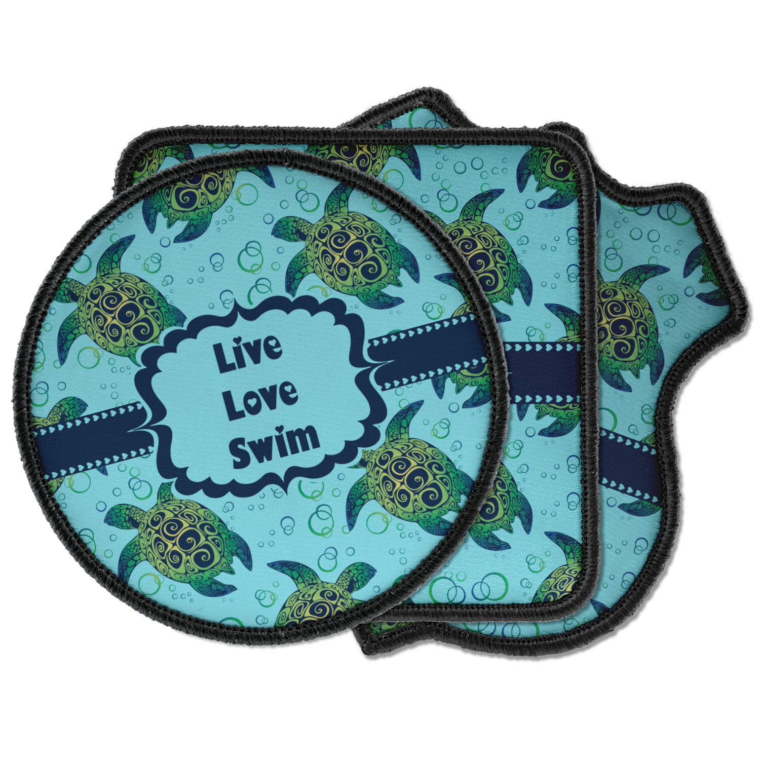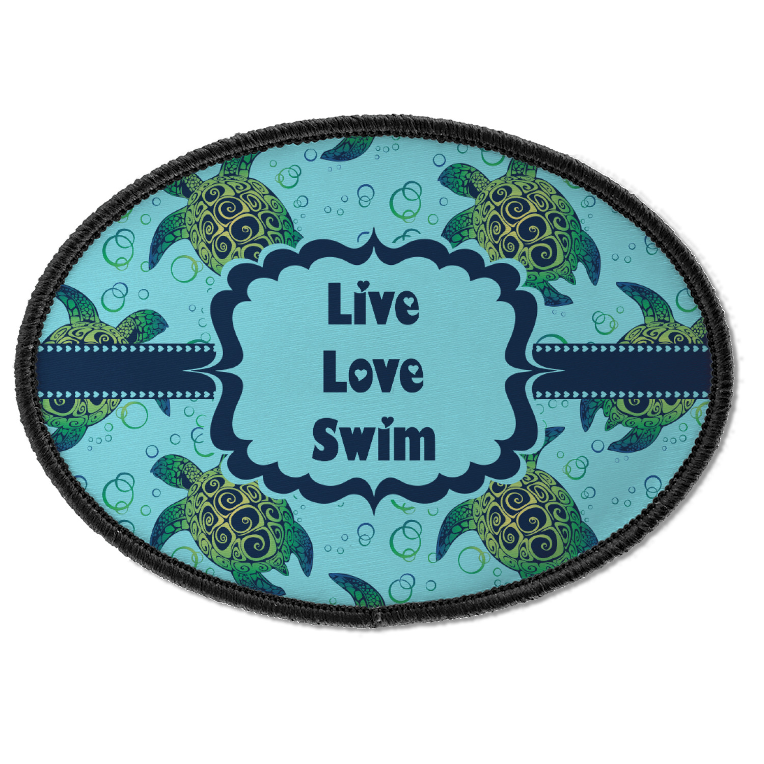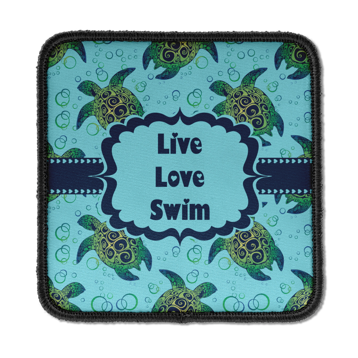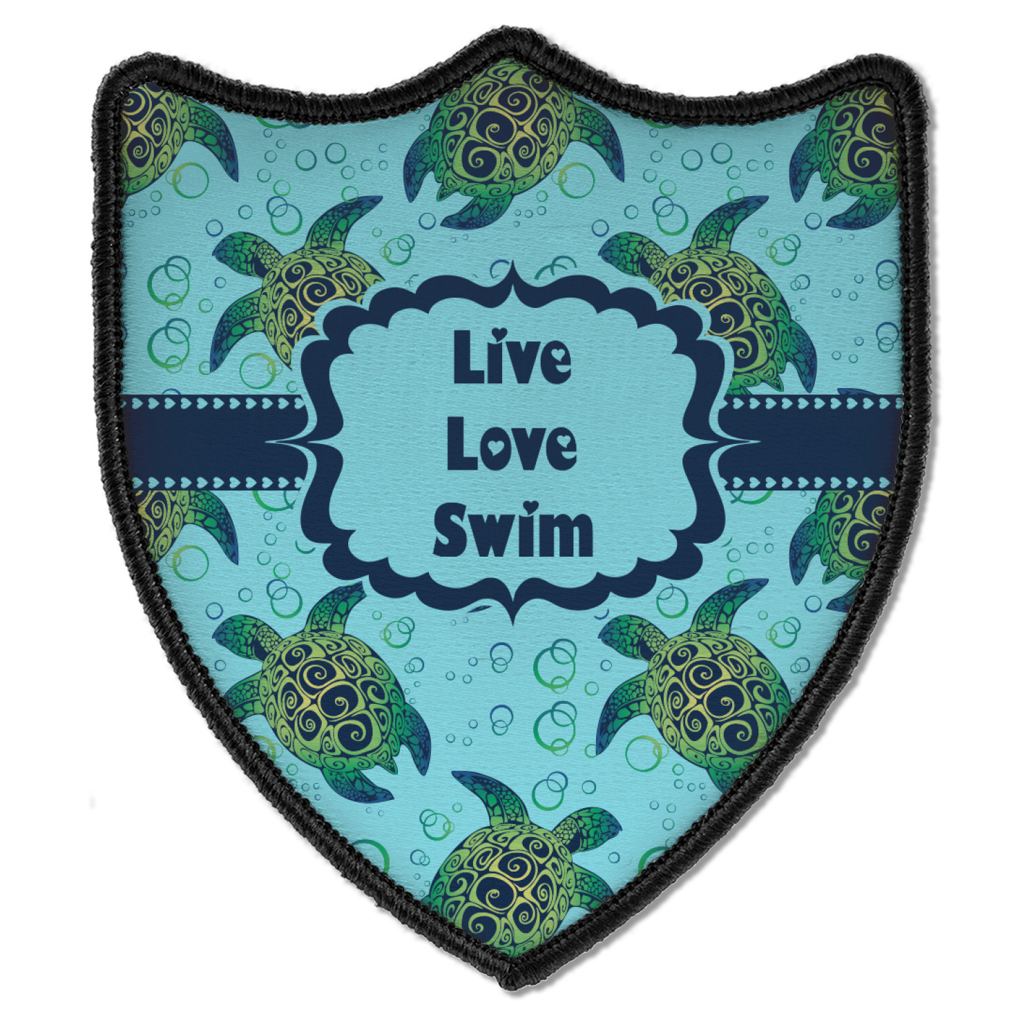 We chose a calming teal for the entire background, navy blue for the turtles background color along with a navy blue ribbon and label. We chose the hearts ribbon, a fancy label and live, love swim for personalization in the hearts font