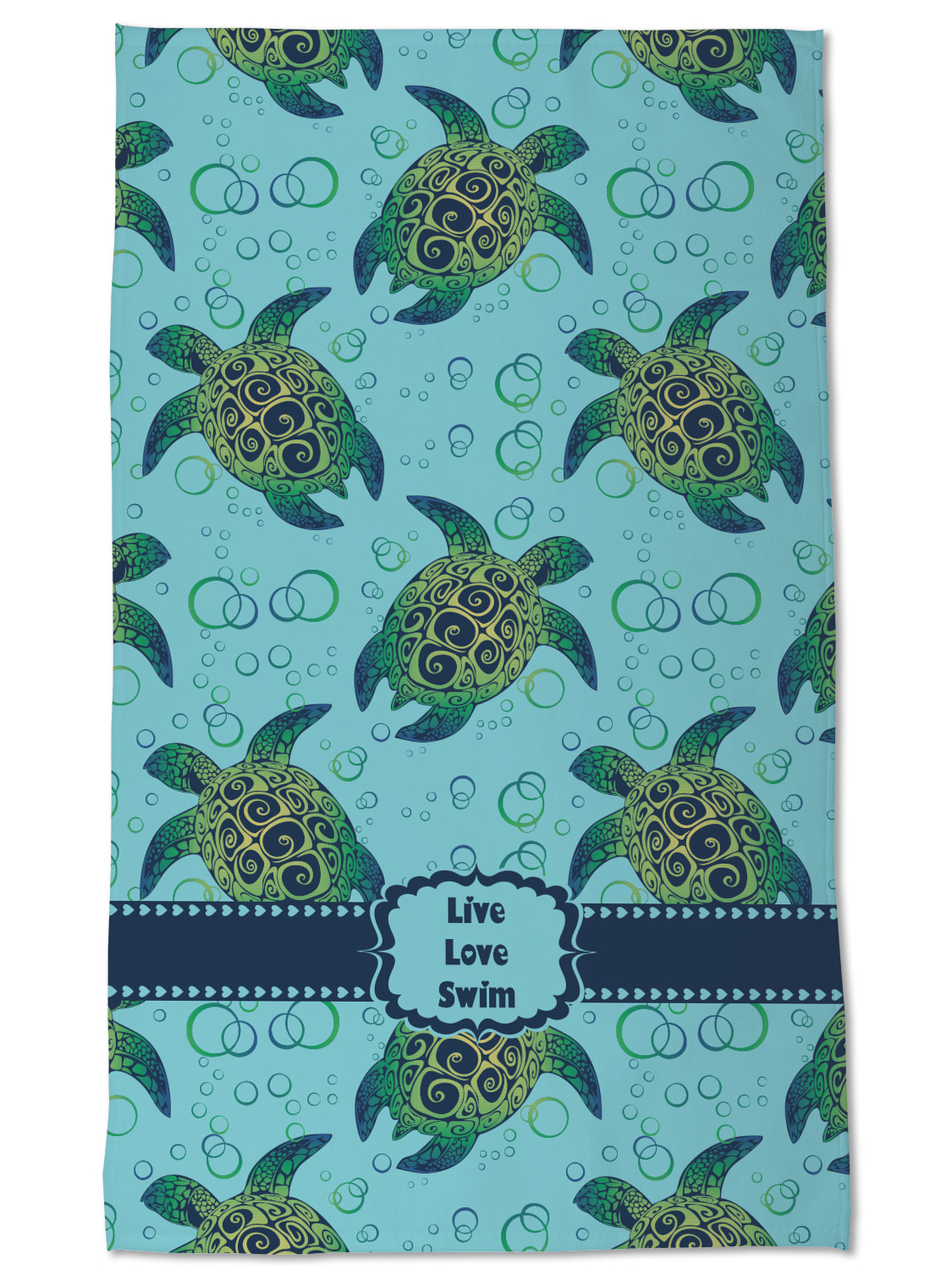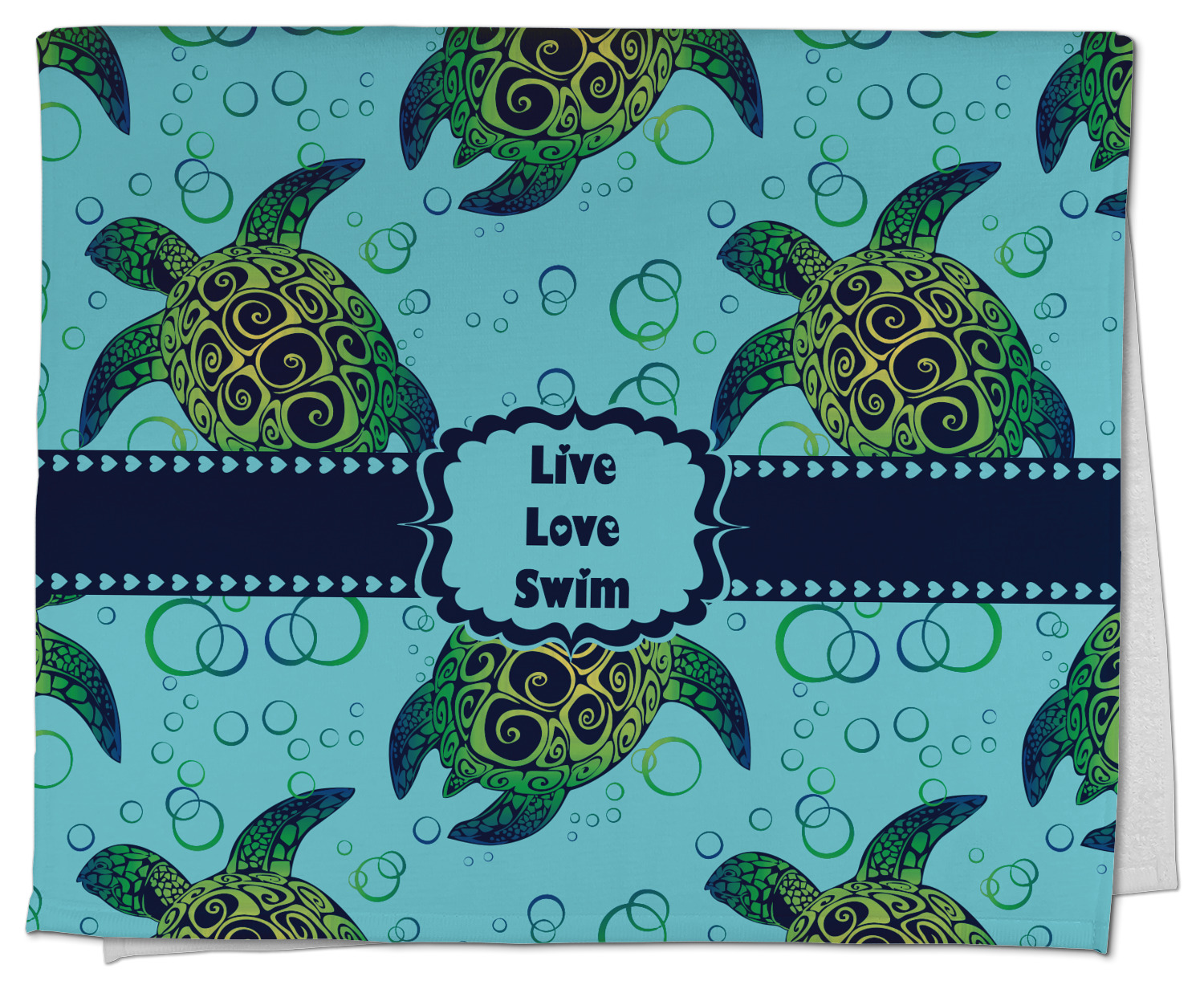 We chose a calming teal for the entire background, navy blue for the turtles background color along with a navy blue ribbon and label. We chose the hearts ribbon, a fancy label and live, love swim for personalization in the hearts font