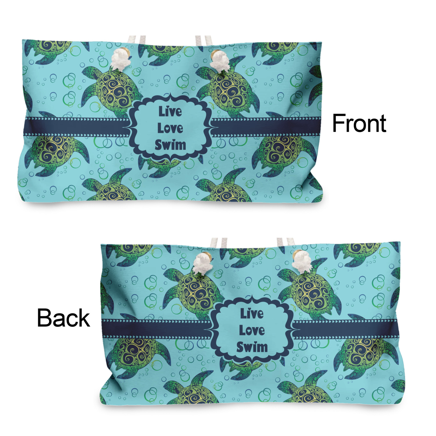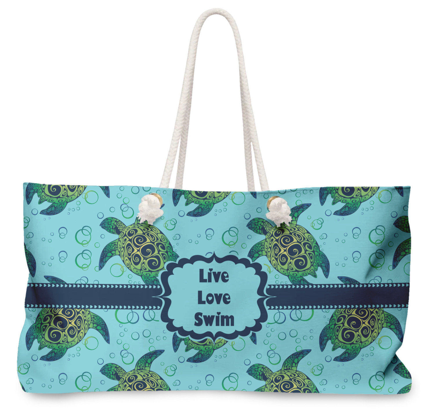 We chose a calming teal for the entire background, navy blue for the turtles background color along with a navy blue ribbon and label. We chose the hearts ribbon, a fancy label and live, love swim for personalization in the hearts font