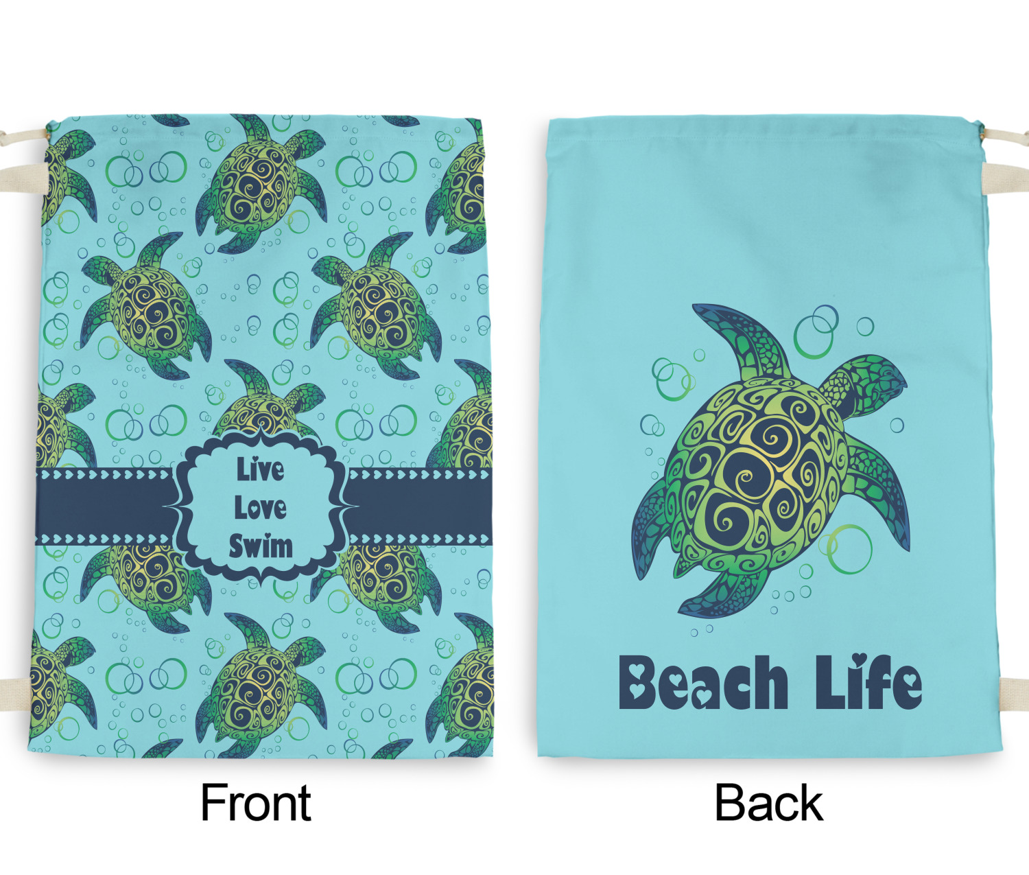 Carry your laundry in style with these customized laundry bags. Available in two sizes, featuring a natural colored woven strap and a cinch cord, these bags hold a lot of clothes or anything else you want to fit in them.