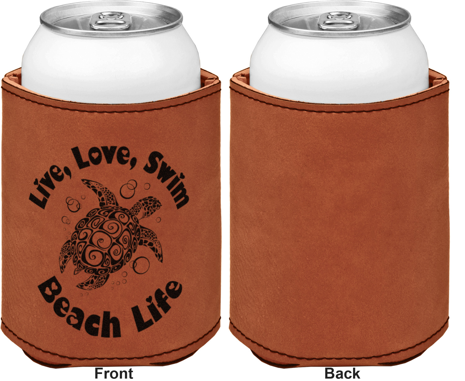 This can sleeve is made from a cognac-brown leatherette and stitched with a sturdy, black thread. A slim padding lines the inside of your can sleeve to allow for a better fit once your drink is inserted. The sleeve itself measures at 4 by 4.5 inches, allowing this custom can sleeve to accommodate most canned drinks. Your personalized design can be engraved on the front and back, or solely the front. When laser-engraved, your design appears as a black coloration which contrasts the leatherette nicely.