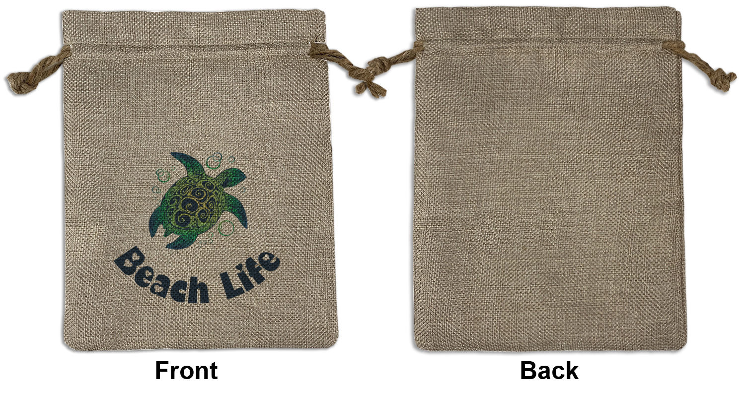 We sell our Burlap Gift Bags in 3 variant sized bags. Made with burlap polyester, each personalized bag can be secured with a twine drawstring pull. Your custom design is available to print on one side or both sides - completely up to you! The sizes of the bags measure approximately 4.5" x 6.5" for the smallest size, 6.5" x 8.0" for the medium size, and 6.5" x 13.5" for the large-sized bag.