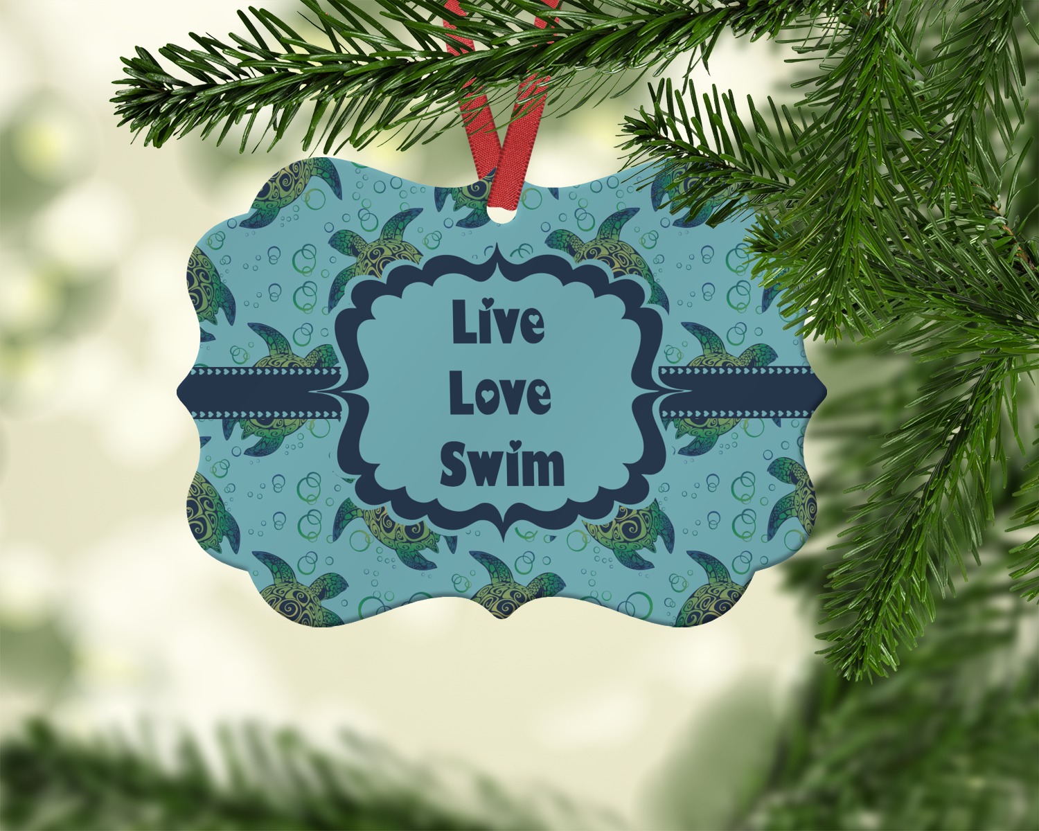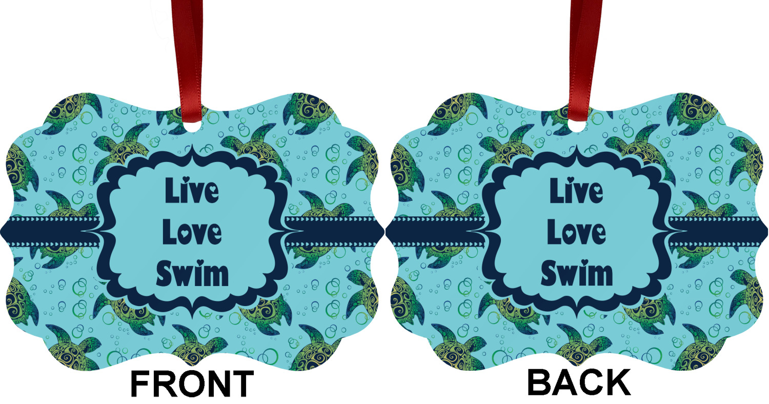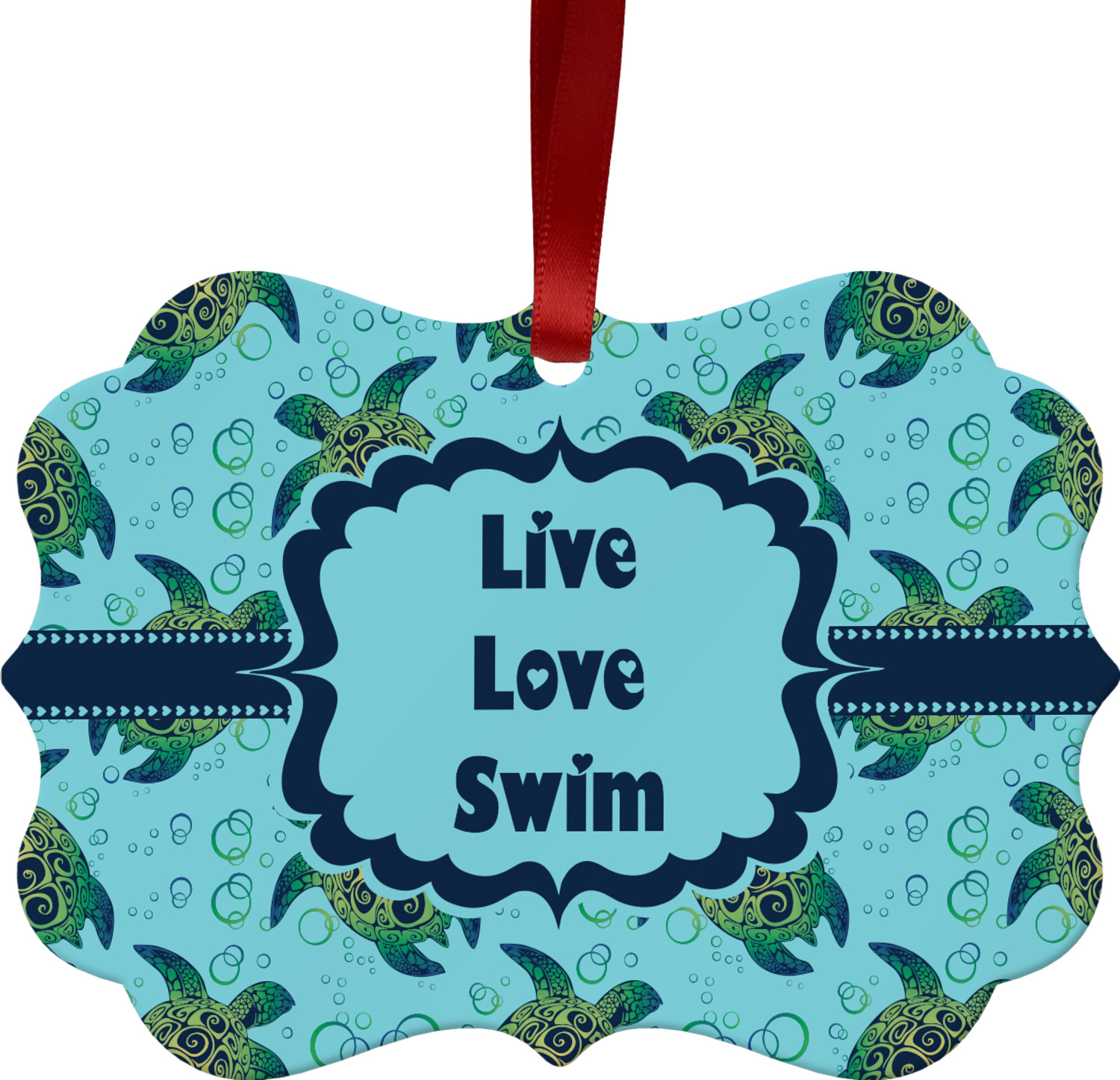 We chose a calming teal for the entire background, navy blue for the turtles background color along with a navy blue ribbon and label. We chose the hearts ribbon, a fancy label and live, love swim for personalization in the hearts font