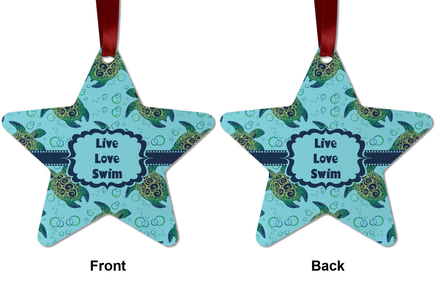 We chose a calming teal for the entire background, navy blue for the turtles background color along with a navy blue ribbon and label. We chose the hearts ribbon, a fancy label and live, love swim for personalization in the hearts font