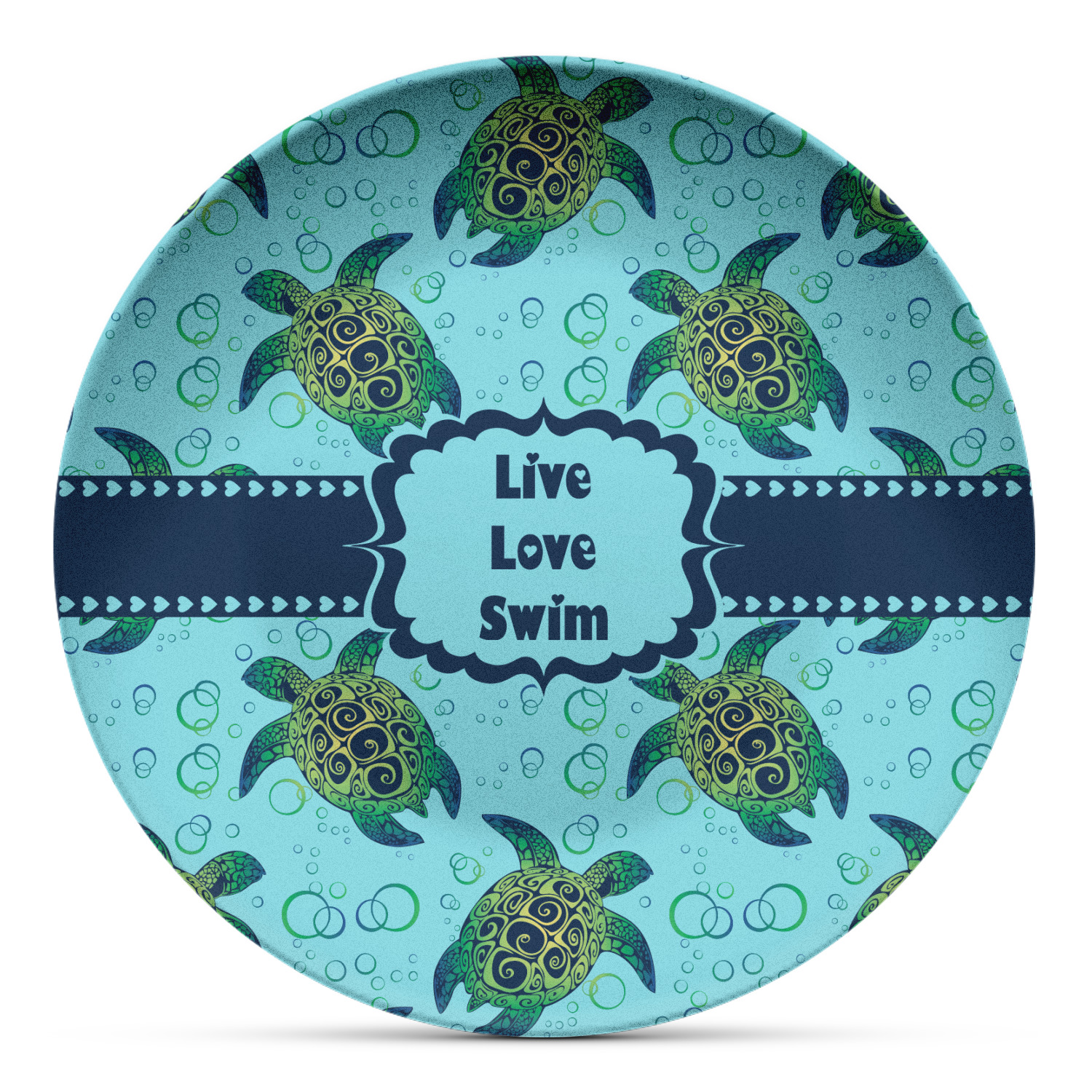 We chose a calming teal for the entire background, navy blue for the turtles background color along with a navy blue ribbon and label. We chose the hearts ribbon, a fancy label and live, love swim for personalization in the hearts font