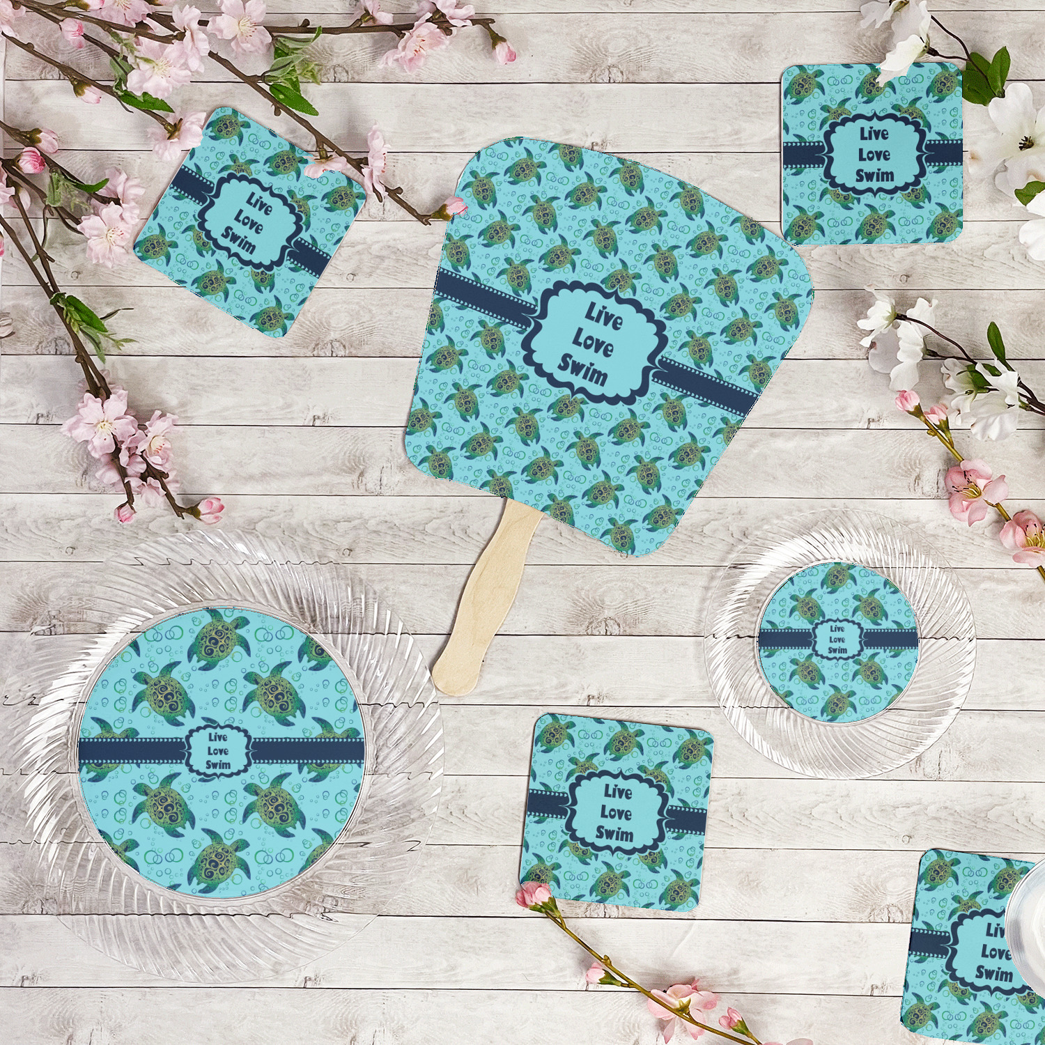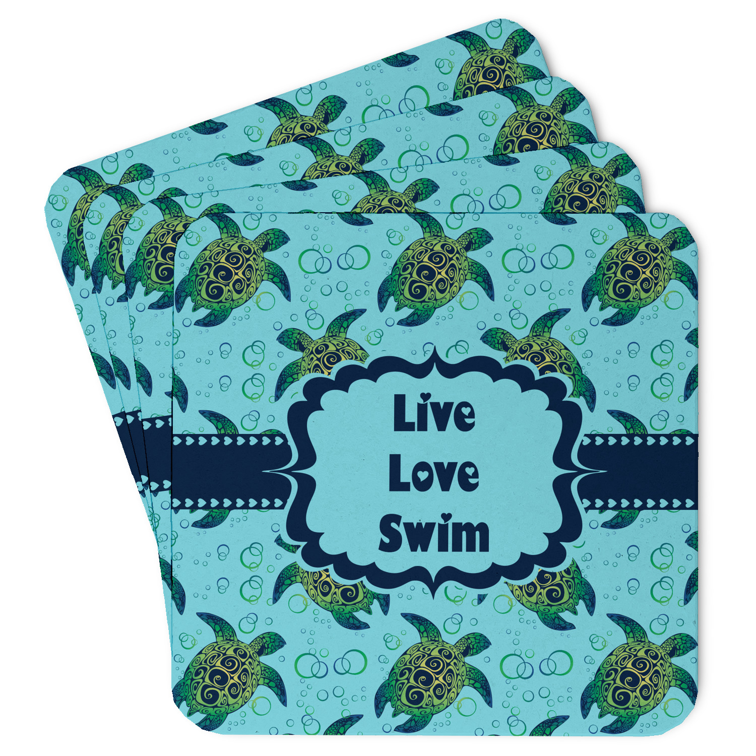 We chose a calming teal for the entire background, navy blue for the turtles background color along with a navy blue ribbon and label. We chose the hearts ribbon, a fancy label and live, love swim for personalization in the hearts font