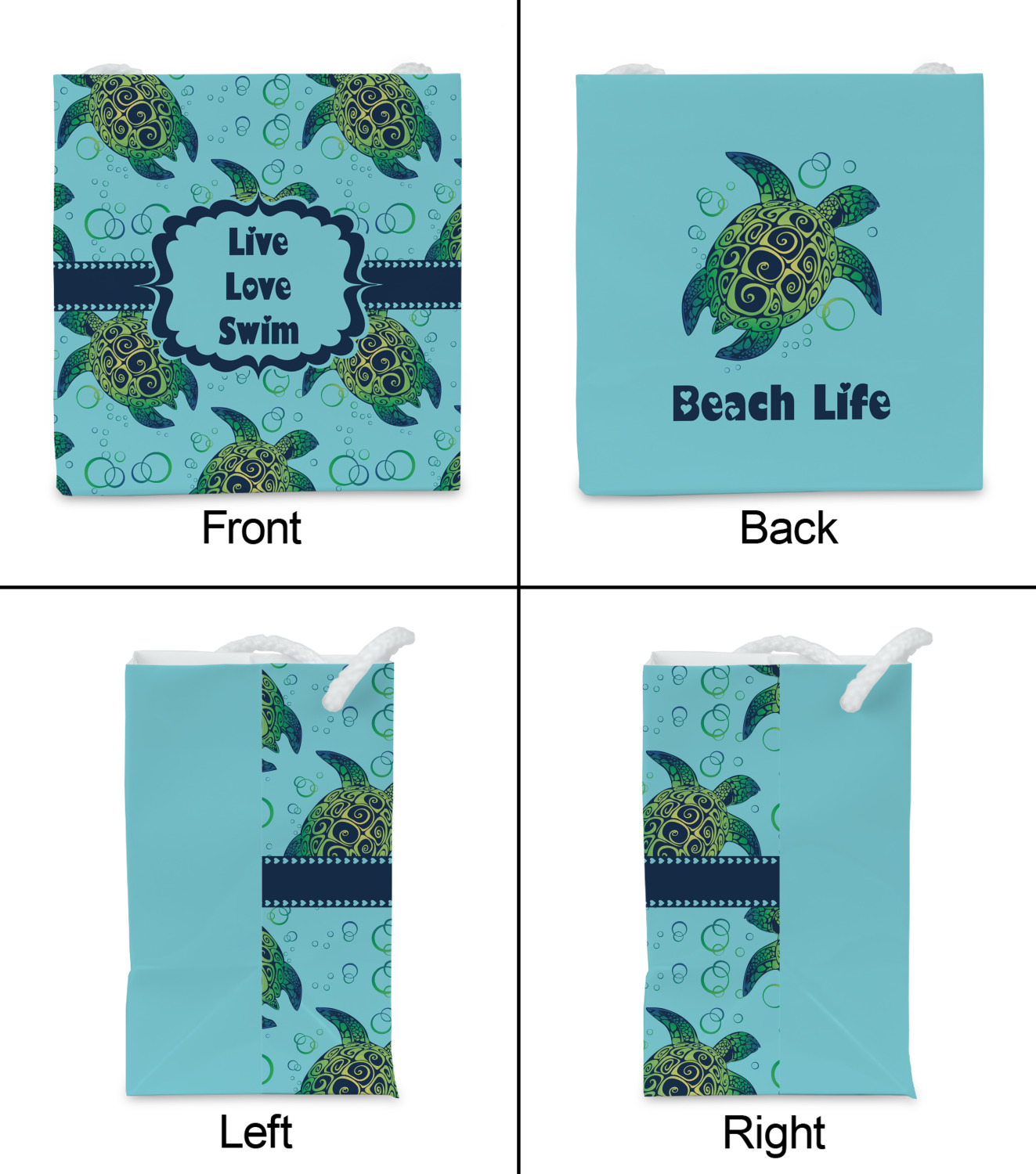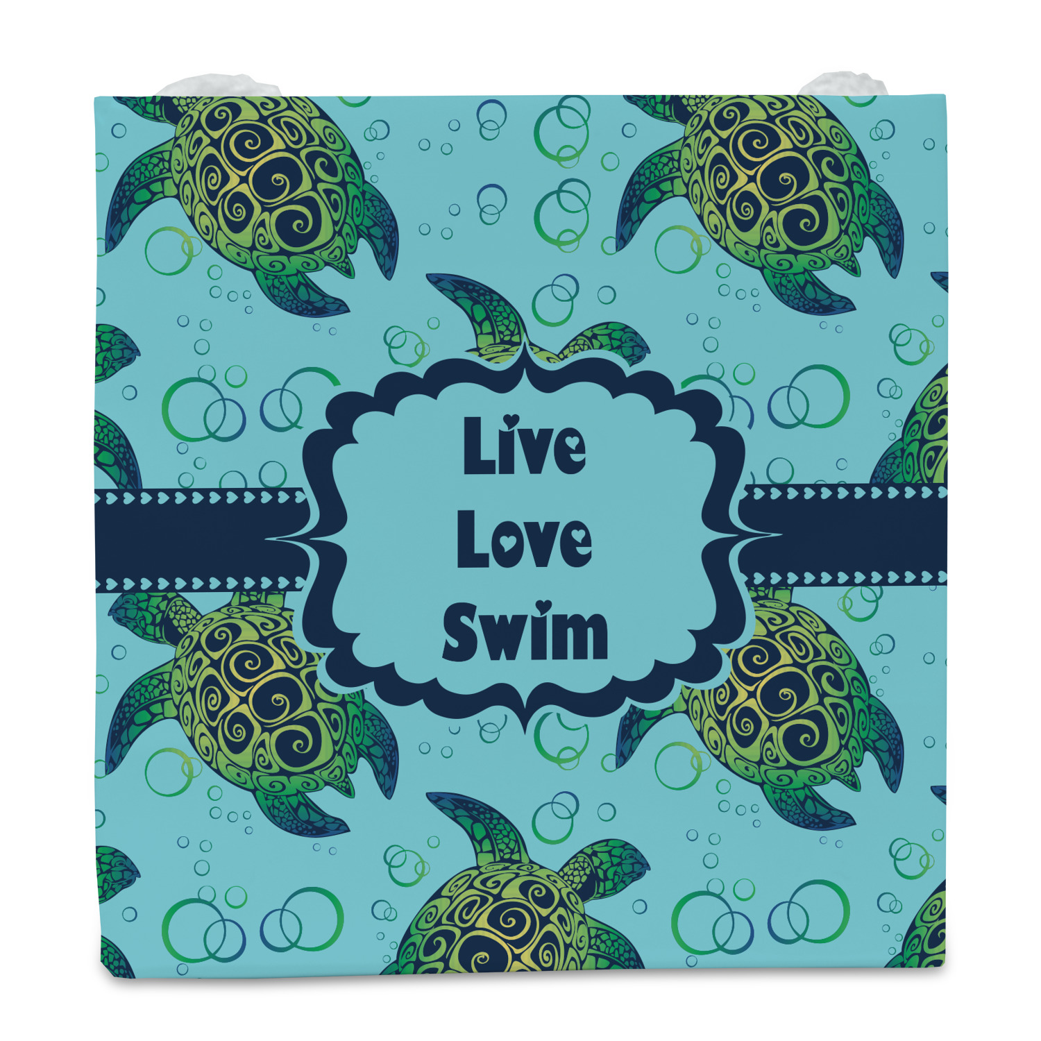 We chose a calming teal for the entire background, navy blue for the turtles background color along with a navy blue ribbon and label. We chose the hearts ribbon, a fancy label and live, love swim for personalization in the hearts font