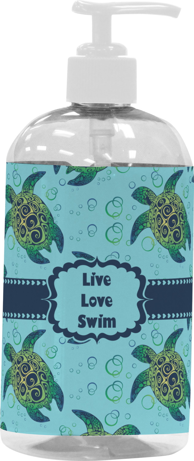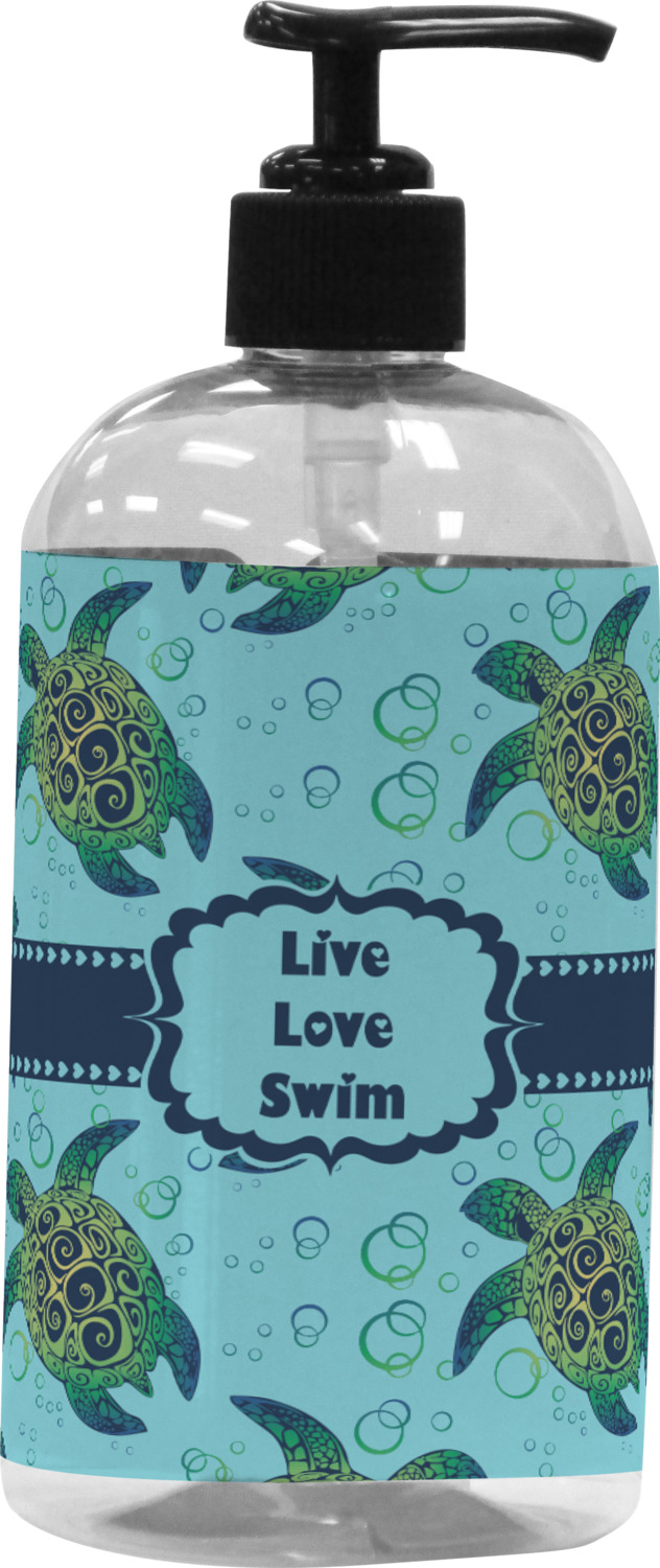 We chose a calming teal for the entire background, navy blue for the turtles background color along with a navy blue ribbon and label. We chose the hearts ribbon, a fancy label and live, love swim for personalization in the hearts font