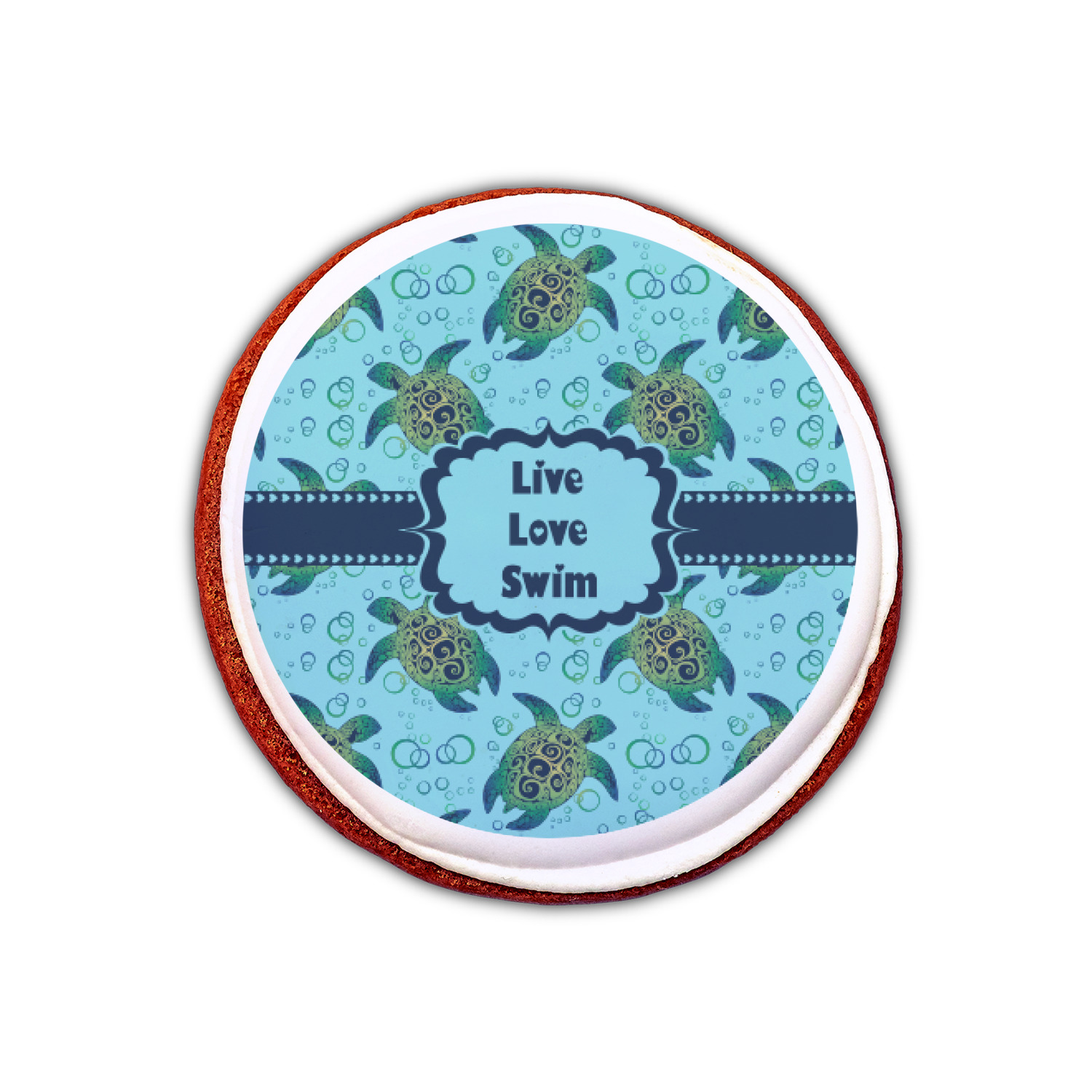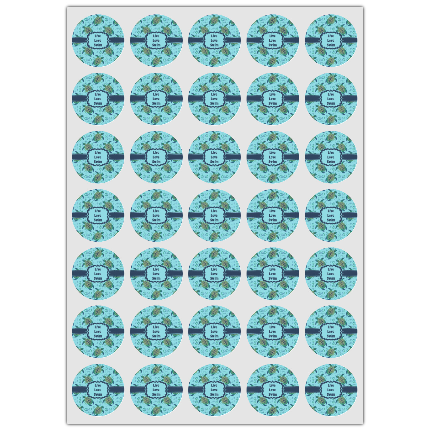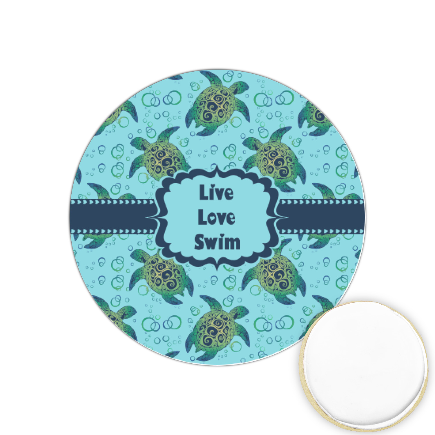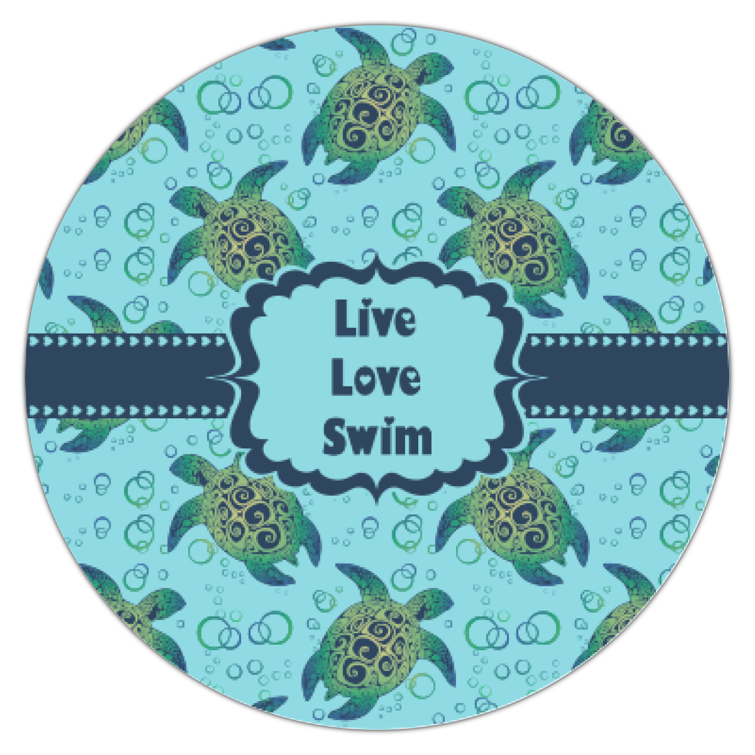 We chose a calming teal for the entire background, navy blue for the turtles background color along with a navy blue ribbon and label. We chose the hearts ribbon, a fancy label and live, love swim for personalization in the hearts font
