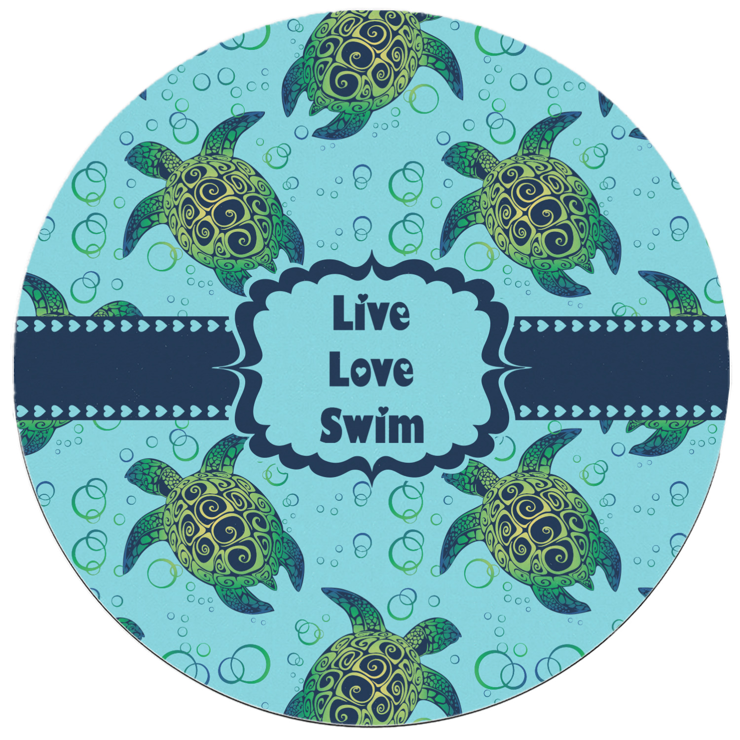 We chose a calming teal for the entire background, navy blue for the turtles background color along with a navy blue ribbon and label. We chose the hearts ribbon, a fancy label and live, love swim for personalization in the hearts font