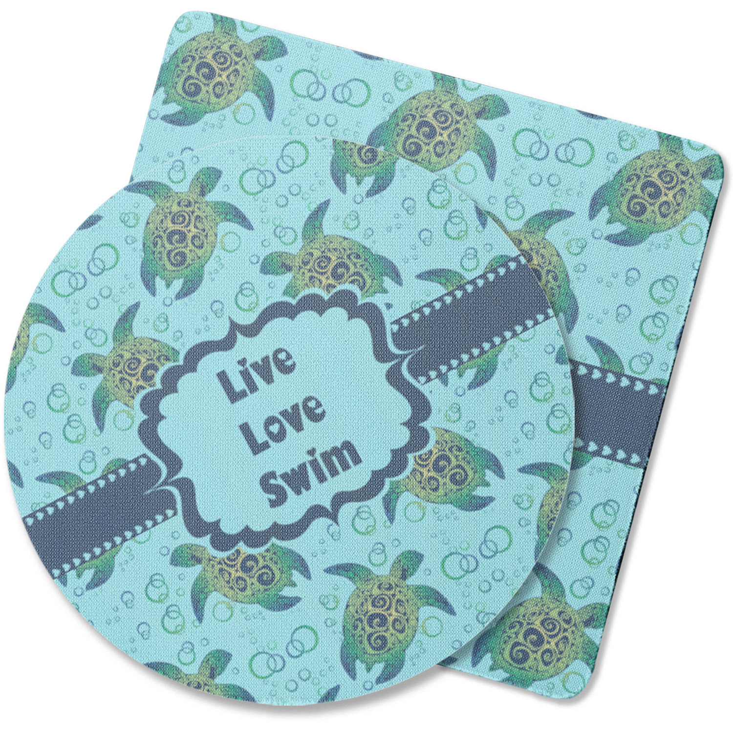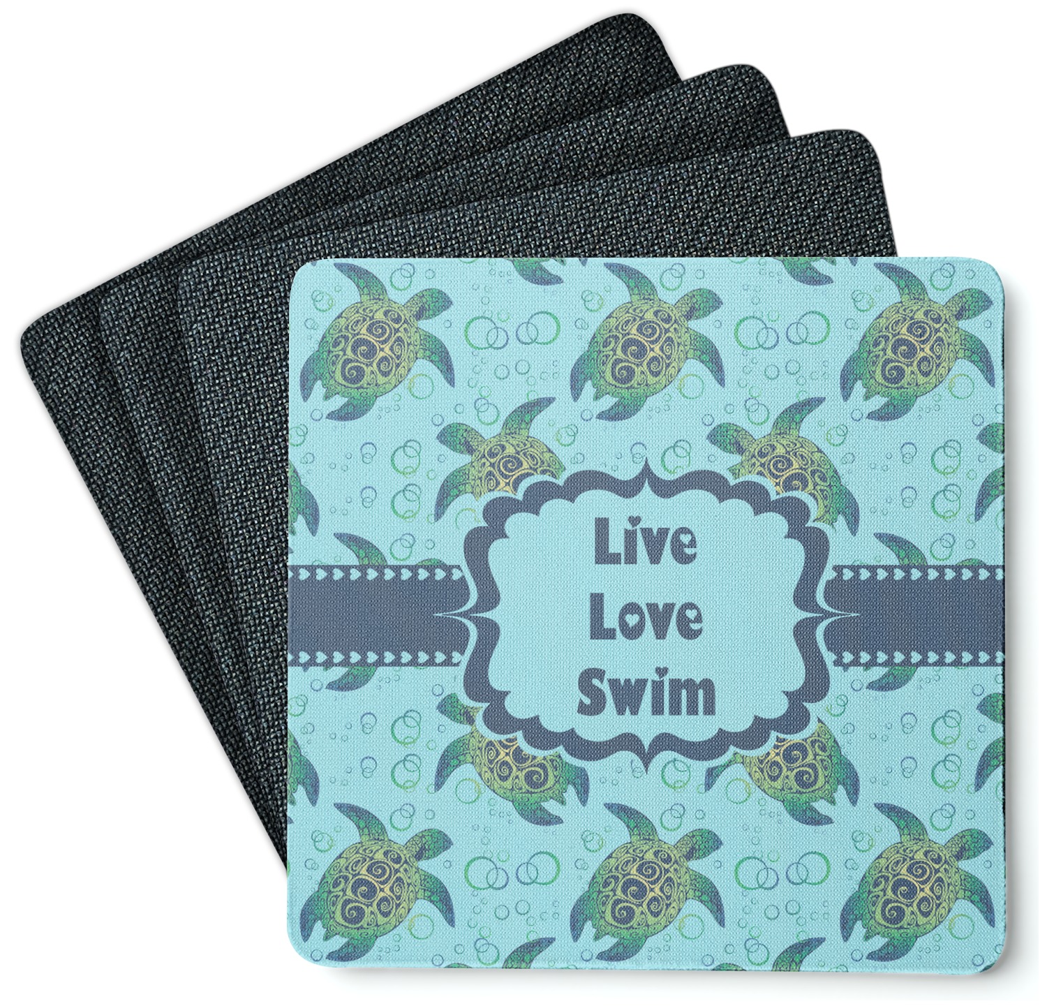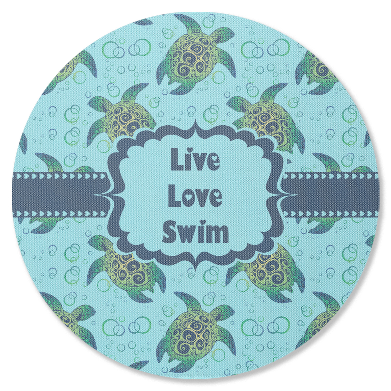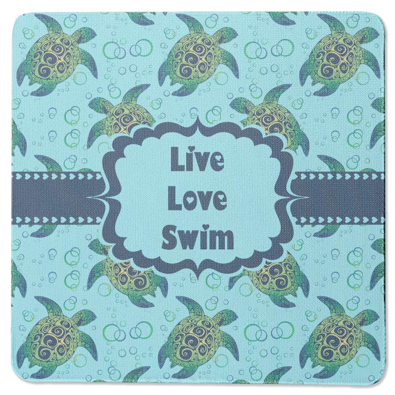 We chose a calming teal for the entire background, navy blue for the turtles background color along with a navy blue ribbon and label. We chose the hearts ribbon, a fancy label and live, love swim for personalization in the hearts font