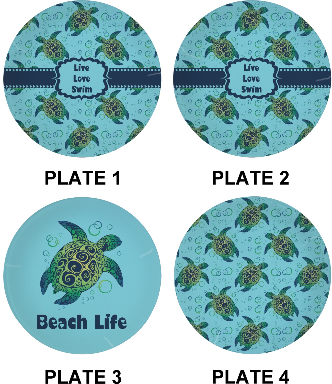 We chose a calming teal for the entire background, navy blue for the turtles background color along with a navy blue ribbon and label. We chose the hearts ribbon, a fancy label and live, love swim for personalization in the hearts font