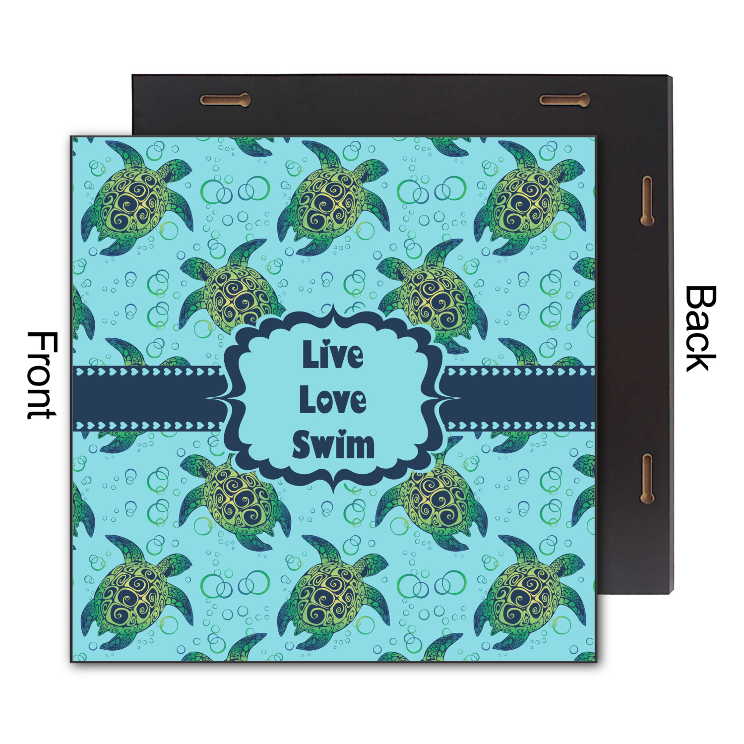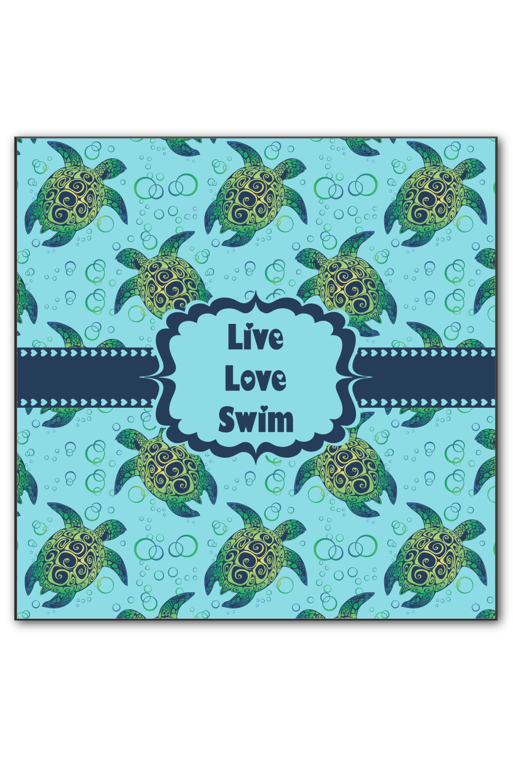 We chose a calming teal for the entire background, navy blue for the turtles background color along with a navy blue ribbon and label. We chose the hearts ribbon, a fancy label and live, love swim for personalization in the hearts font