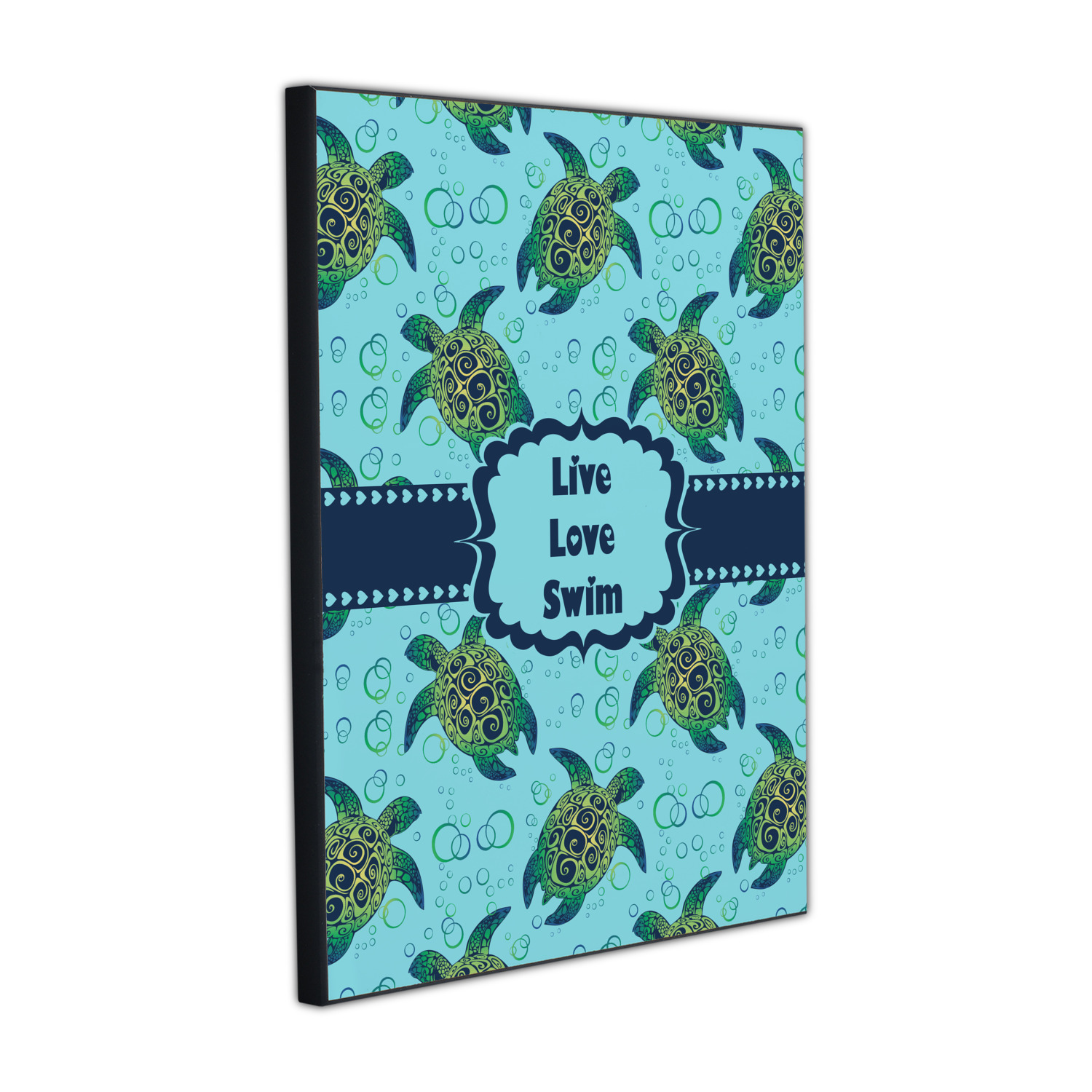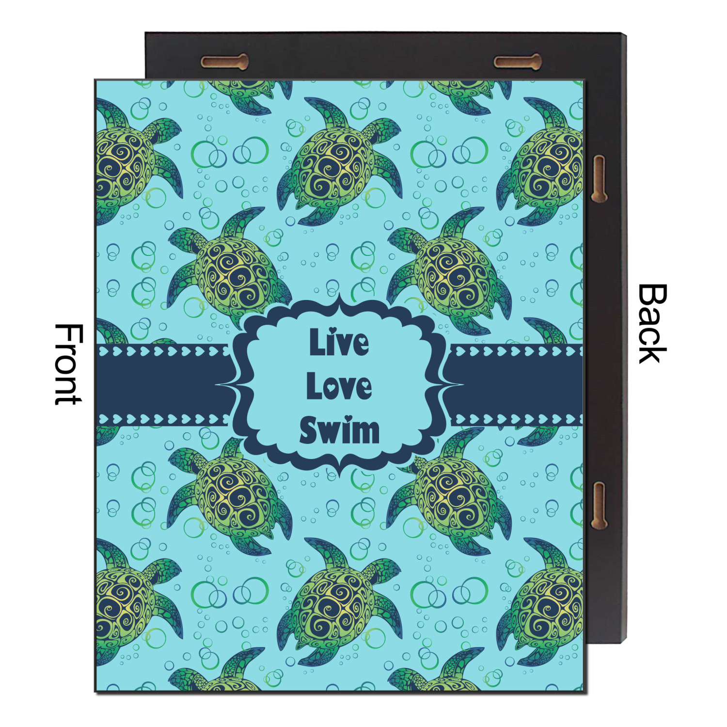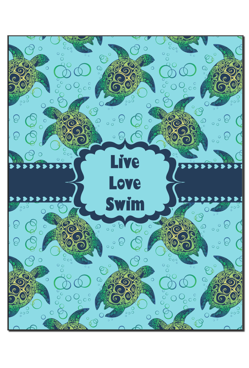 We chose a calming teal for the entire background, navy blue for the turtles background color along with a navy blue ribbon and label. We chose the hearts ribbon, a fancy label and live, love swim for personalization in the hearts font