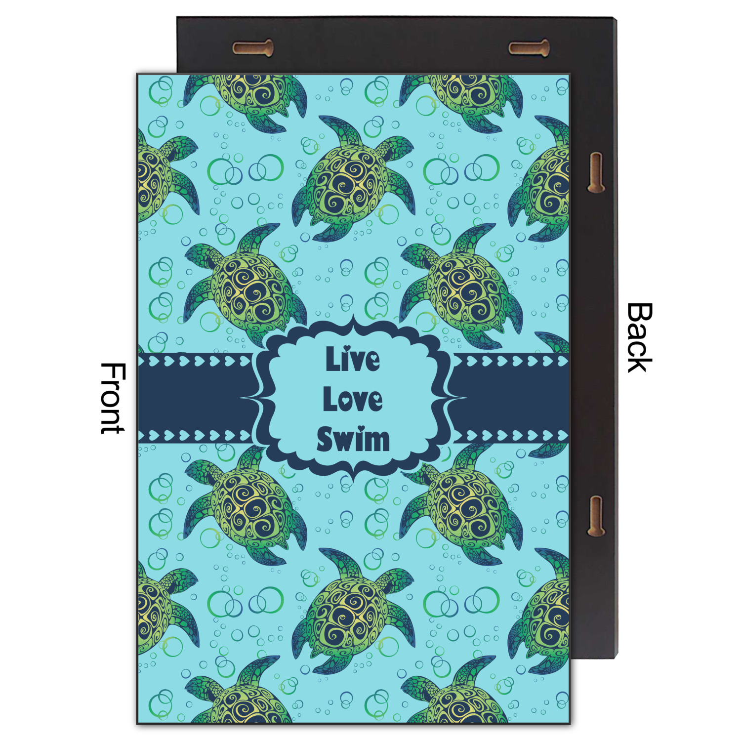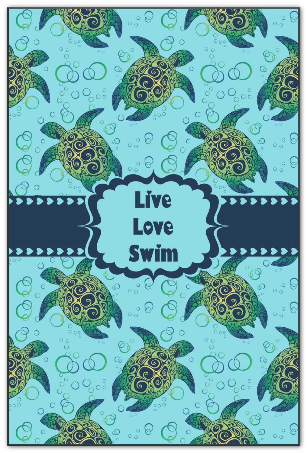 We chose a calming teal for the entire background, navy blue for the turtles background color along with a navy blue ribbon and label. We chose the hearts ribbon, a fancy label and live, love swim for personalization in the hearts font