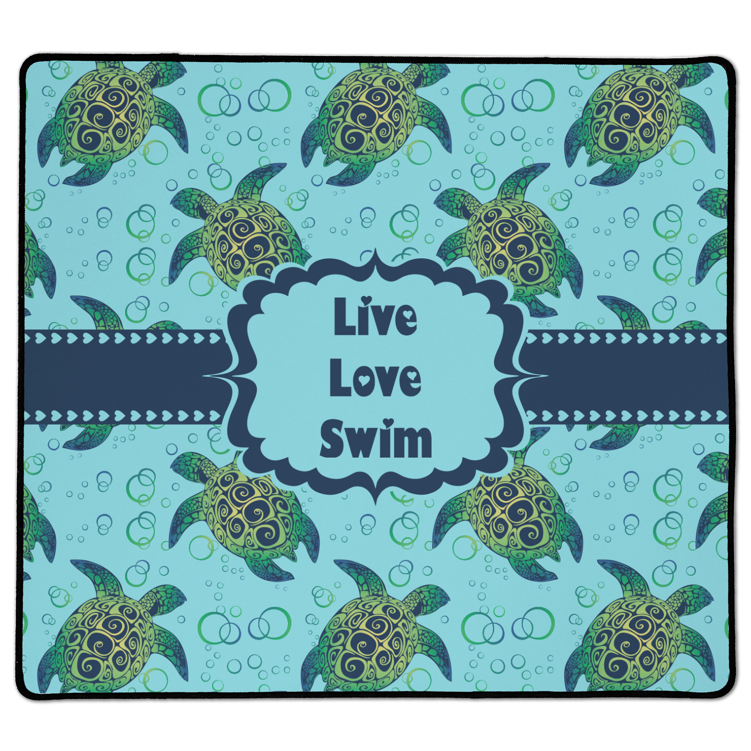We chose a calming teal for the entire background, navy blue for the turtles background color along with a navy blue ribbon and label. We chose the hearts ribbon, a fancy label and live, love swim for personalization in the hearts font