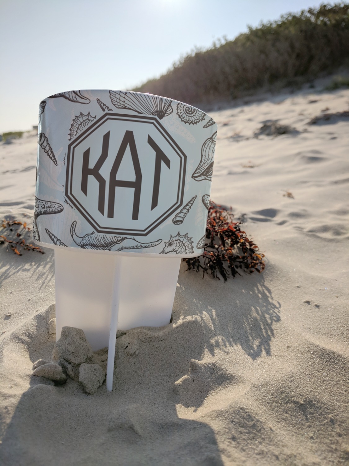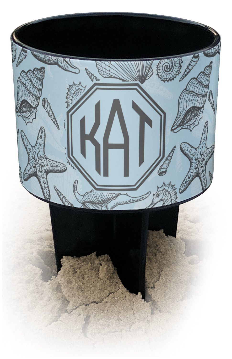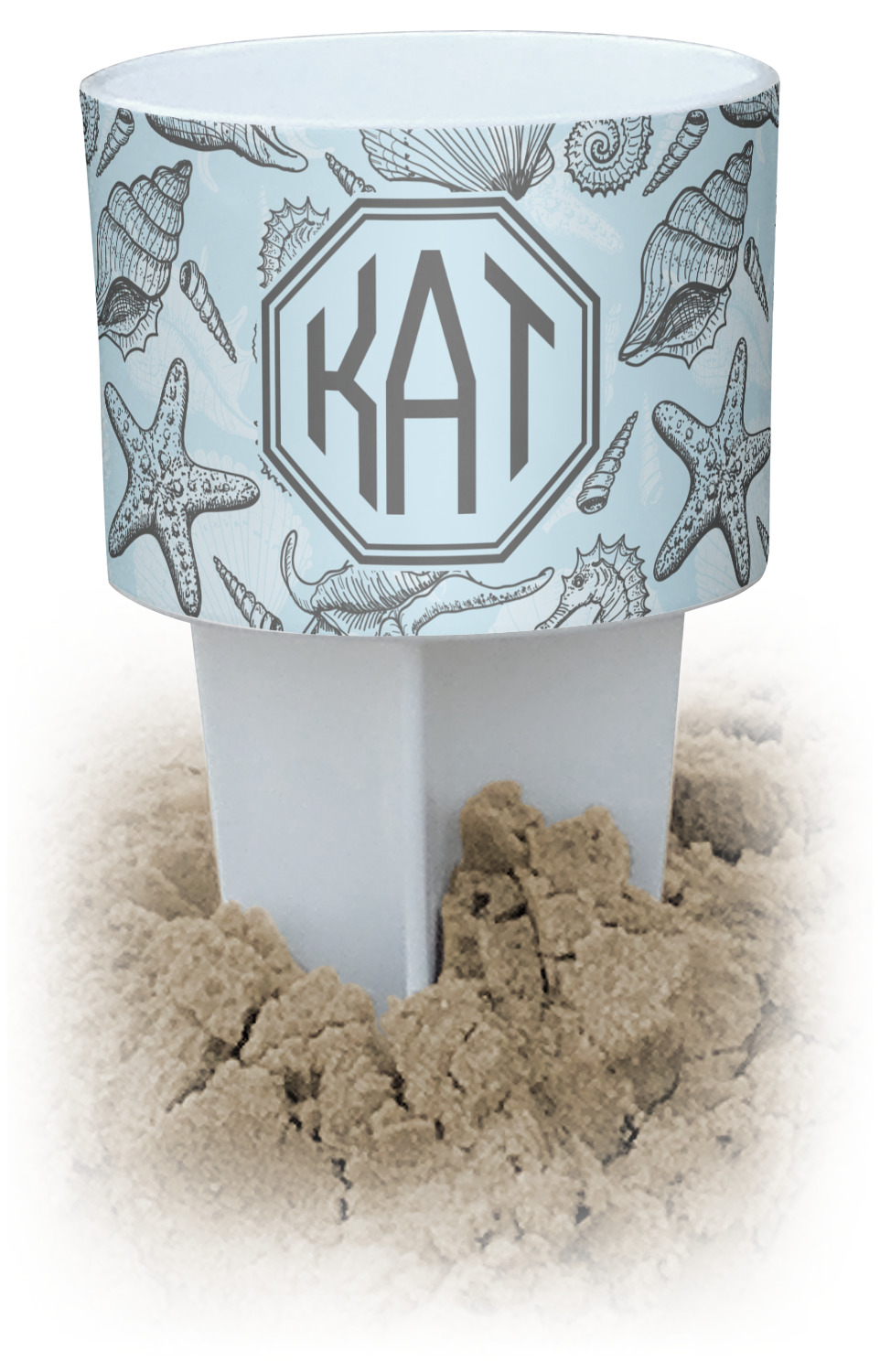 This cup holder has a large stake at its bottom that anchors it to the sand or ground below, while the cup holder rests above the stake. The entire drink holder is made of durable plastic and displays your customization around the cup holder portion. We sell these personalized beach spikers in two different colors: black and white.