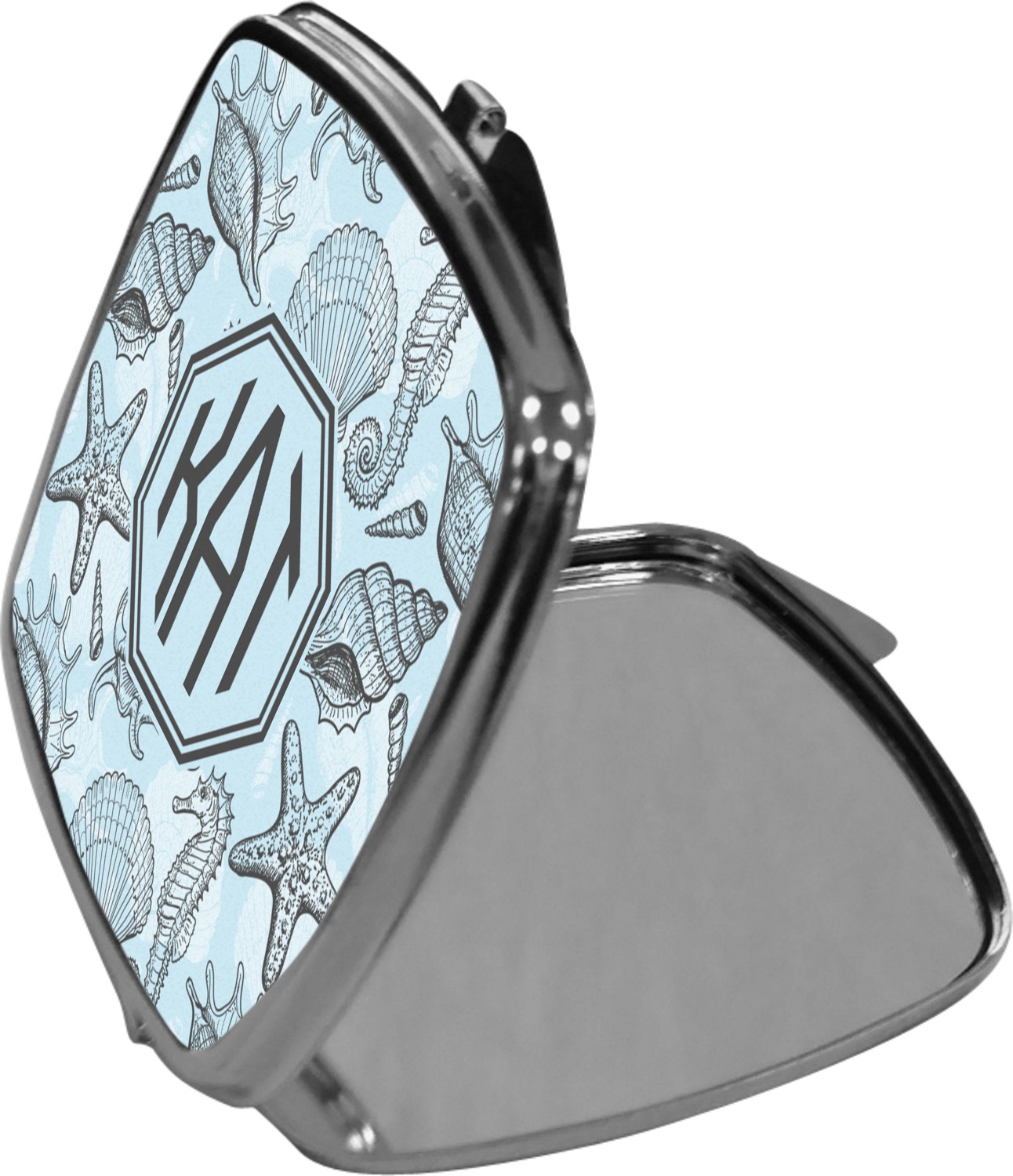 Our compact mirrors are customized with your design on one side. The other side is patterned silver tone metal. Inside, there are two mirrors.