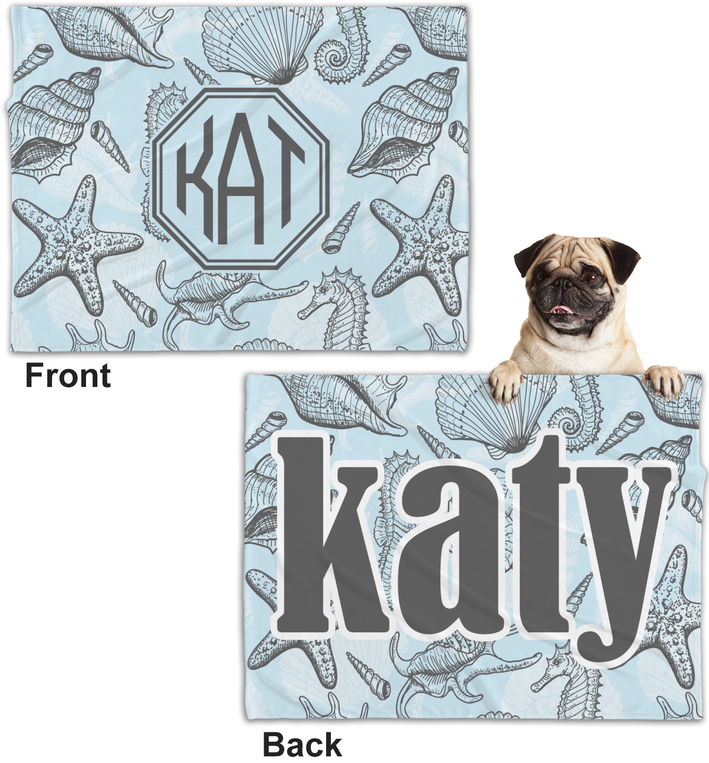 These dog blankets are crafted from a gentle, soft-to-the-touch, minky material. We print your customizations, either matching or differing, on both the top and underside of the blanket. These personalized dog blankets are available in two sizes: regular and large. Our regular size, at 40" x 30", accommodates small and some medium size dogs. At 60" x 50", our large dog blanket is a better fit for bigger breeds. Though specialized for dogs, these blankets still make a thoughtful gift for your favorite feline, or any other pet in mind!