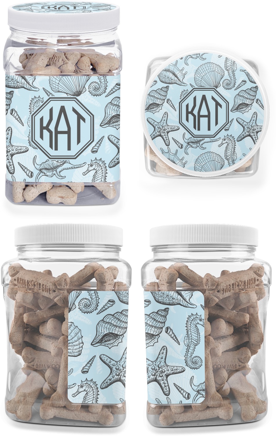 This half gallon jar, made from a sturdy plastic, is the perfect way to keep treats from any naughty pet paws, while still keeping them ready on hand for when your pup performs an impressive trick. This dog cookie jar features a screw-on, white lid that displays your personalized design on a vinyl sticker. We apply another customized sticker that wraps around the front and sides of the jar. Our dog treat jar also has indentations on the rear ends of the sides, which allows for convenient handling, and its square frame allows for easy storage.