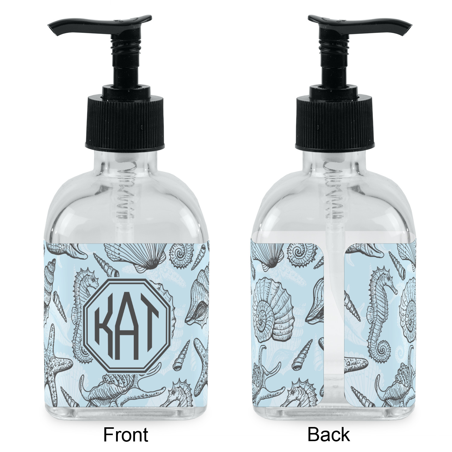 Crafted from a high-quality glass, these soap dispensers and lotion dispensers are durable and robust, while still looking elegant. They are sold with black pumps. Each soap dispenser pump measures at 6.5 by 2.25 inches. On these soap pumps, we display your customized design on a personalized vinyl adhesive on three sides. That way, you can judge how much liquid is in the bottles from the back.
