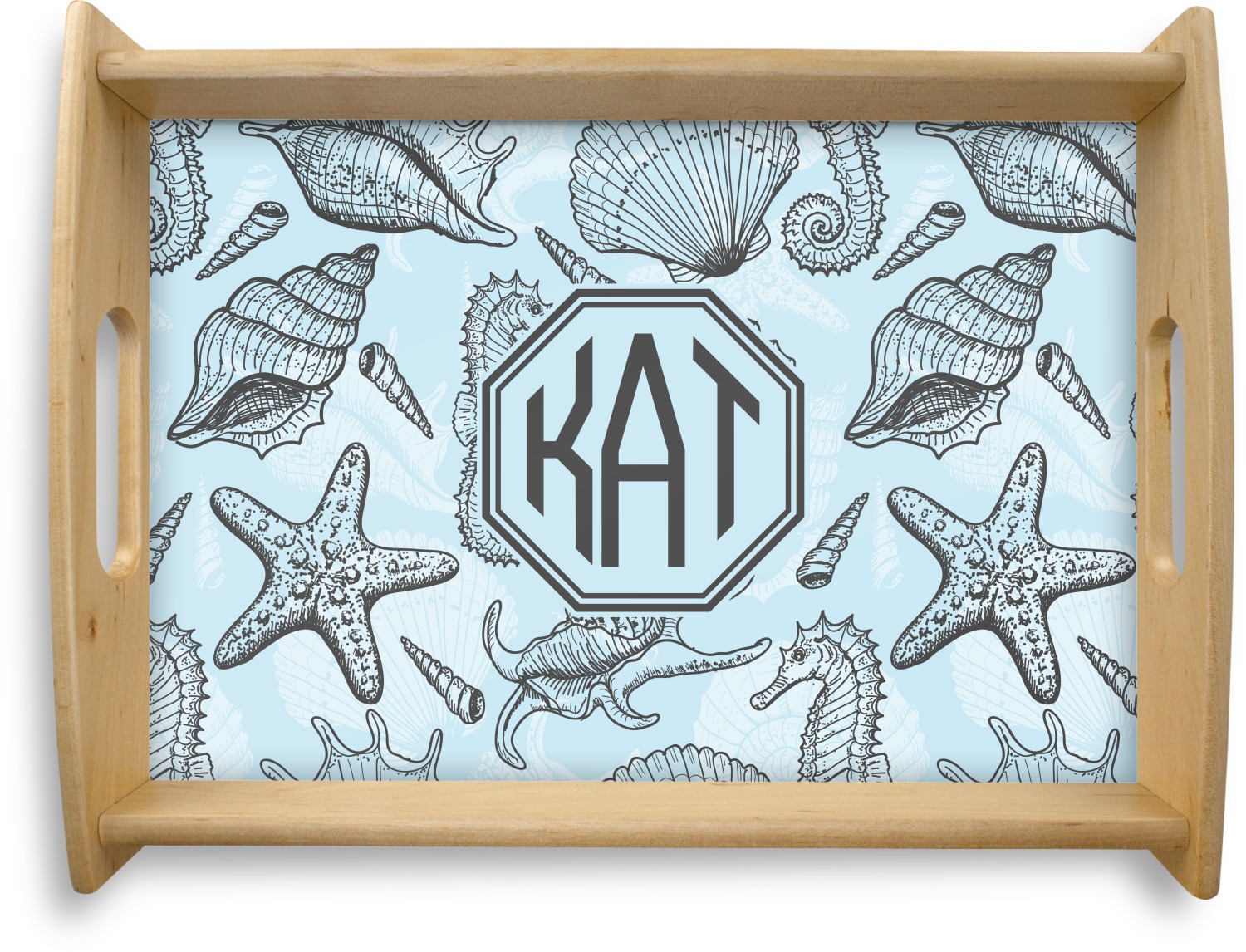 This serving tray with handles features square edges and two rounded sides, creating a very modern look. Each side is fabricated from a beautifully cut, natural wood. The bottom of the interior of the tray displays your customized design in bright, vibrant color. The tray is sold in both a black color and a natural wood look. Each variation of the wood serving tray has two sizes: Small, which is 14" x 10" x 2.25", and Large, which is 19.5" x 13.5" x 2.75".