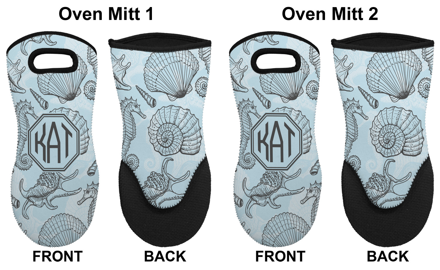 These heat resistant gloves are made entirely of a durable neoprene; the front features a softer texture, while the palm's side has a textured surface, meant to handle heat up to 500 degrees Fahrenheit. Thick, heavy duty stitching connects the two sides. A small, oval cutout appears on the front, and can be used to hang and store the mitt. Your personalization appears on the front, and the upper part of the back of the mitt. The style of these oven mitts are suitable for both the right and left hand, depending on your needs. If you need one for each hand, be sure to order two!