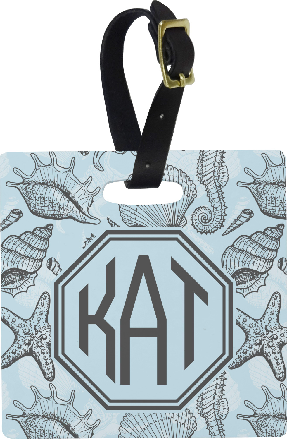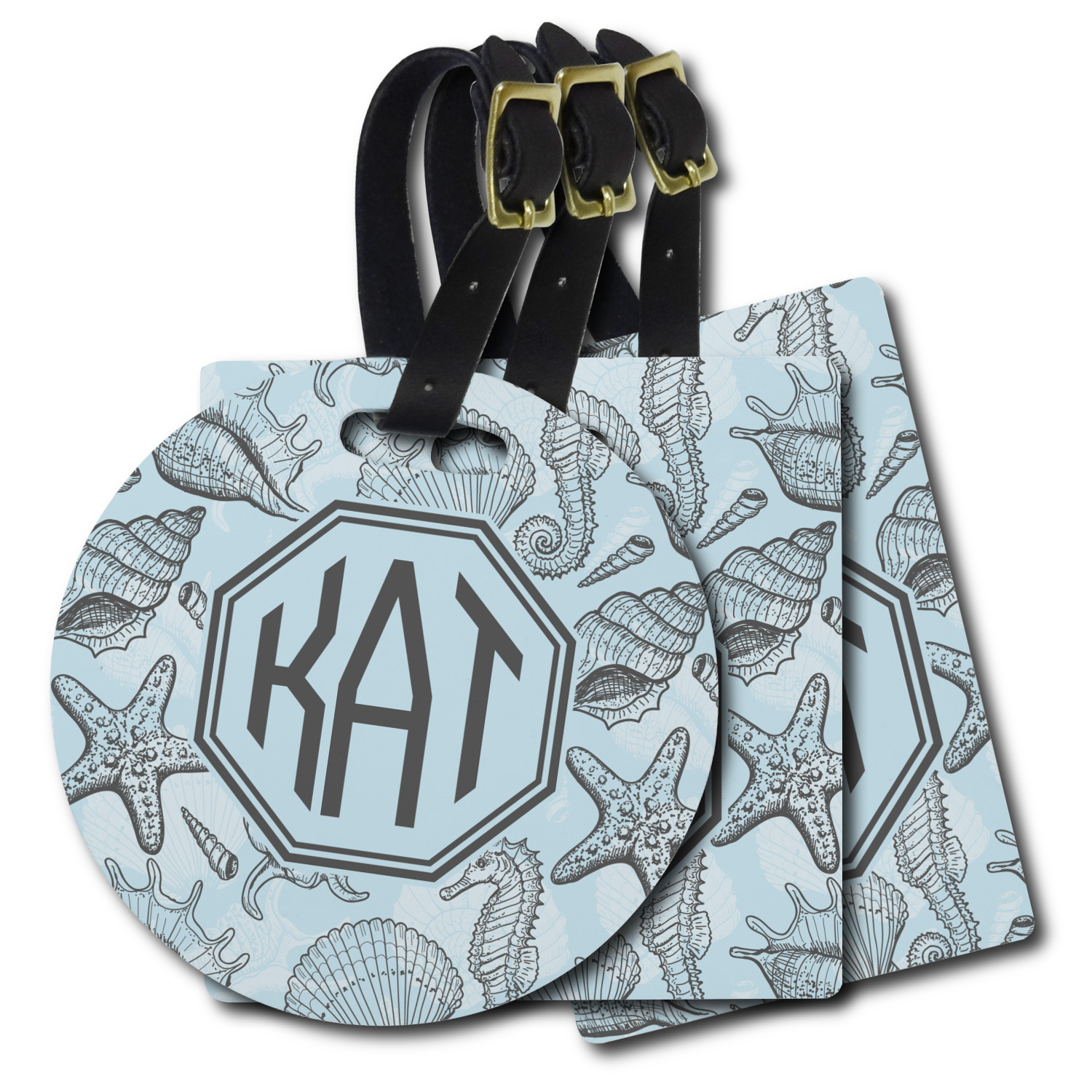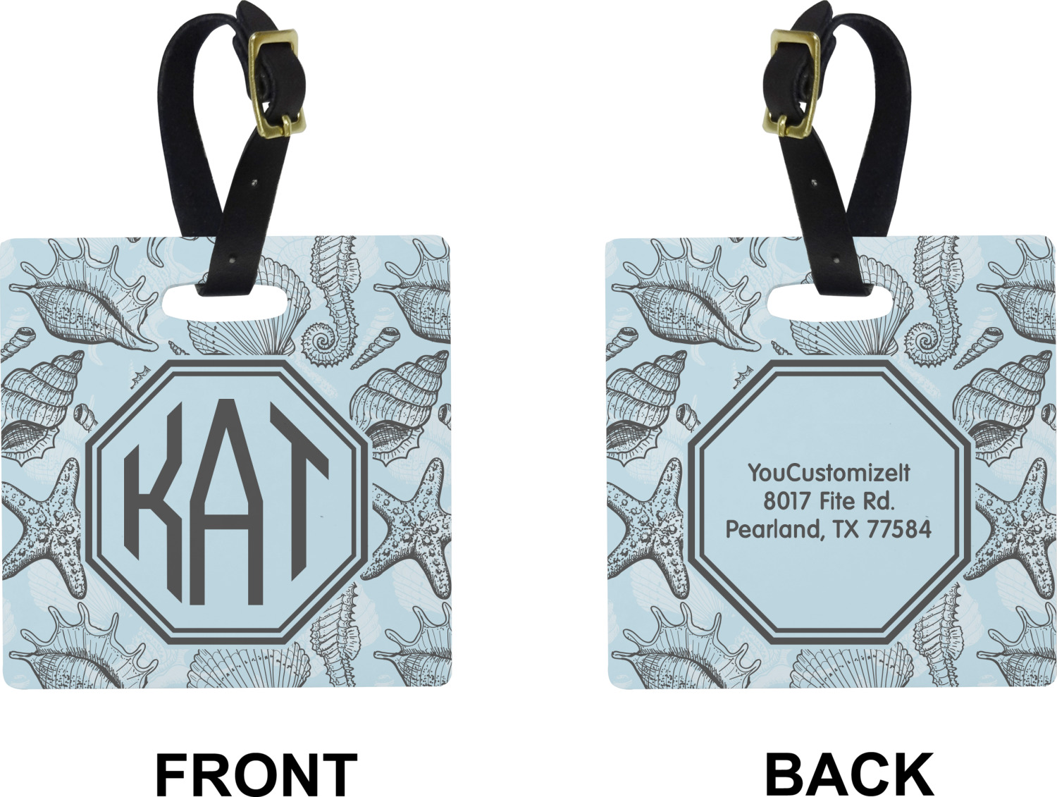 These personalized bag tags are sold in a variety of shapes, so that you may find the product that meets your vision exactly. We sell a round luggage tag, which measures at approximately 4" x 4". Our square luggage tag is about 3.5" x 3.5", while our rectangular version is 2.75" x 4 ".