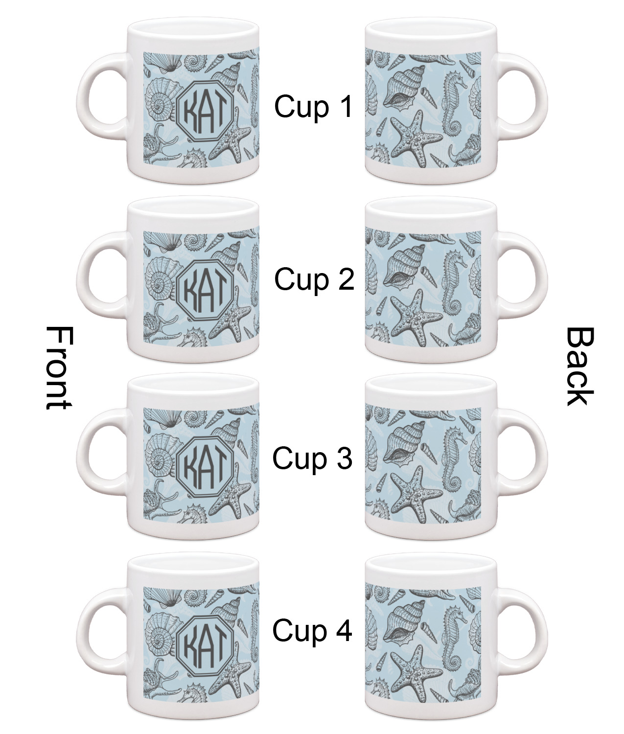 Each of our espresso mugs is a ceramic material sure to keep your drink warm. Personalize one cup for yourself, or order a set of 4! Its the perfect little gift for any coffee lover! We carry two sizes for you to personalize - 3 oz. (approx. 3.25" x 2.325" x 2.625") or 6 oz. (approx. 4" x 2.9" x 2.9"). Our 3 oz. mug is perfect for that single shot espresso while our 6 oz. mug can be your next favorite cappuccino cup holding two shots of espresso!