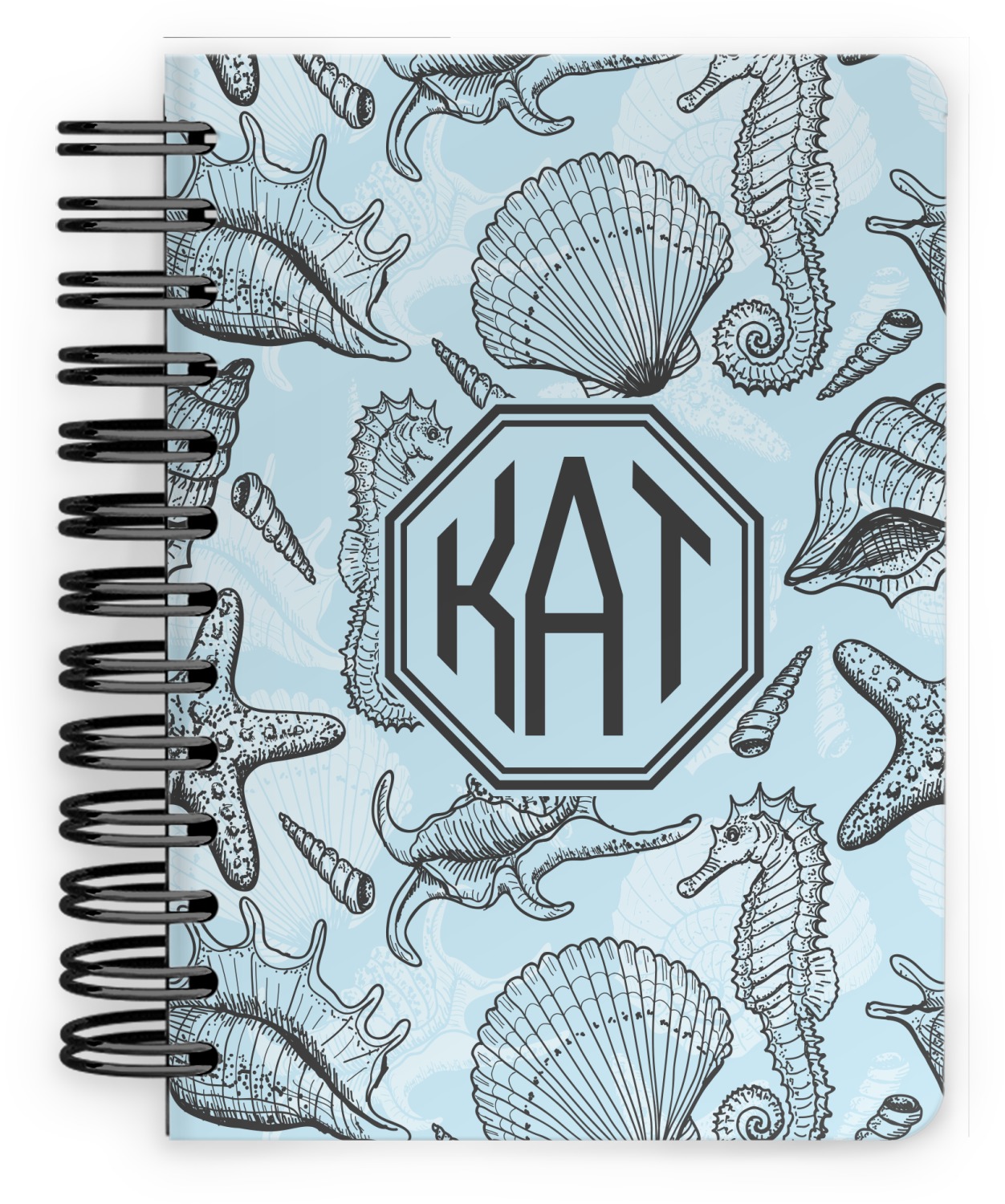 This spiral notebook includes 75 sheets of thick, ruled paper. The front and back of this custom notebook is made of a robust, laminate, plastic covering. We print your personalization on these two panels, underneath a glossy finish, which emphasizes the colors of your design. The two panels and the sheets of paper are held together by a sturdy, black coil. The paper within your bound notebook is perforated for easy, clean tearing.
