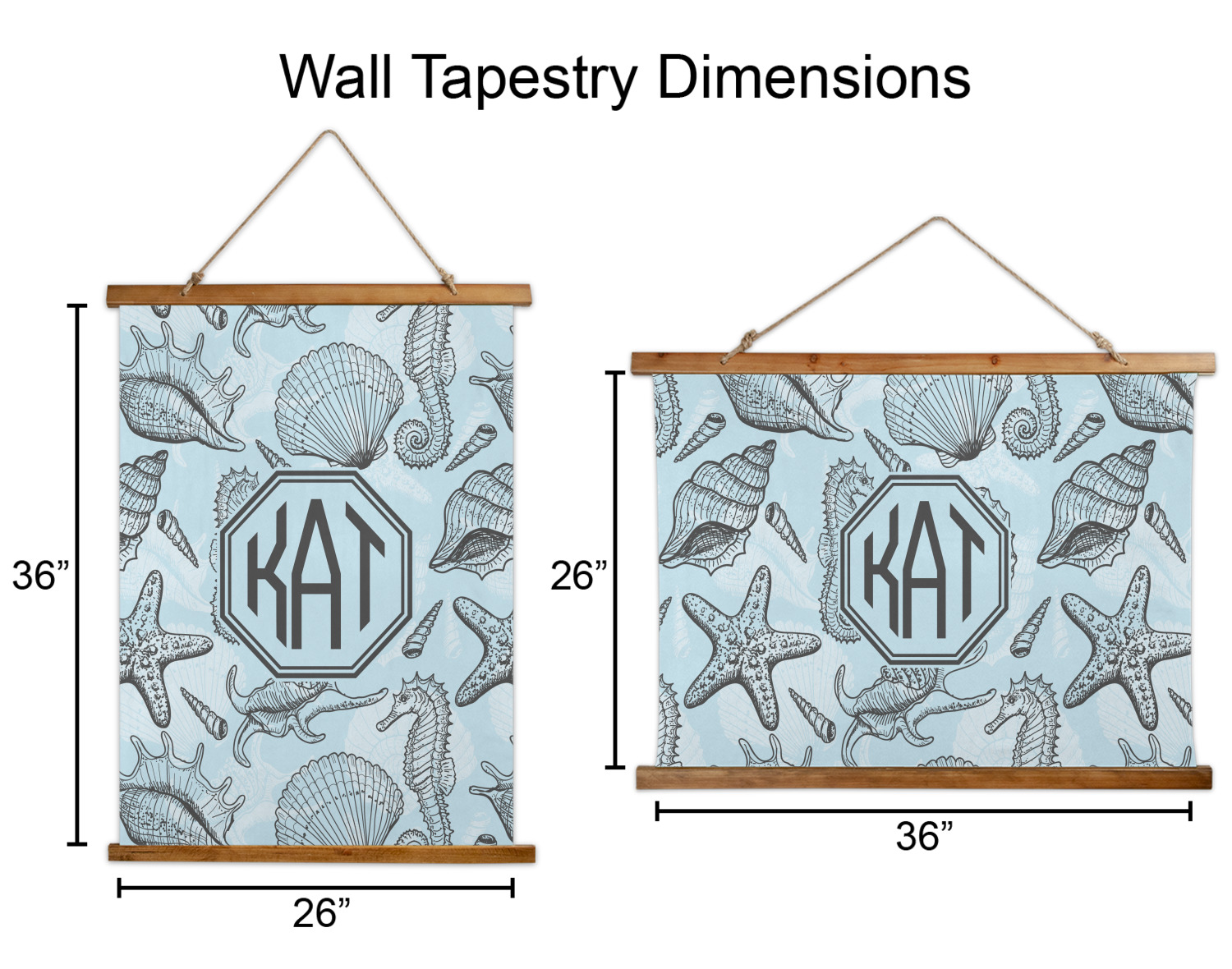 Made in two different orientations - portrait or landscape - both are 26" x 36". Your design is printed on a high quality polyester fabric with hemmed edges. The wood on the top and bottom of the tapestry is 1.25" tall and 0.25" thick and there are two pieces on top and bottom which sandwich the fabric.