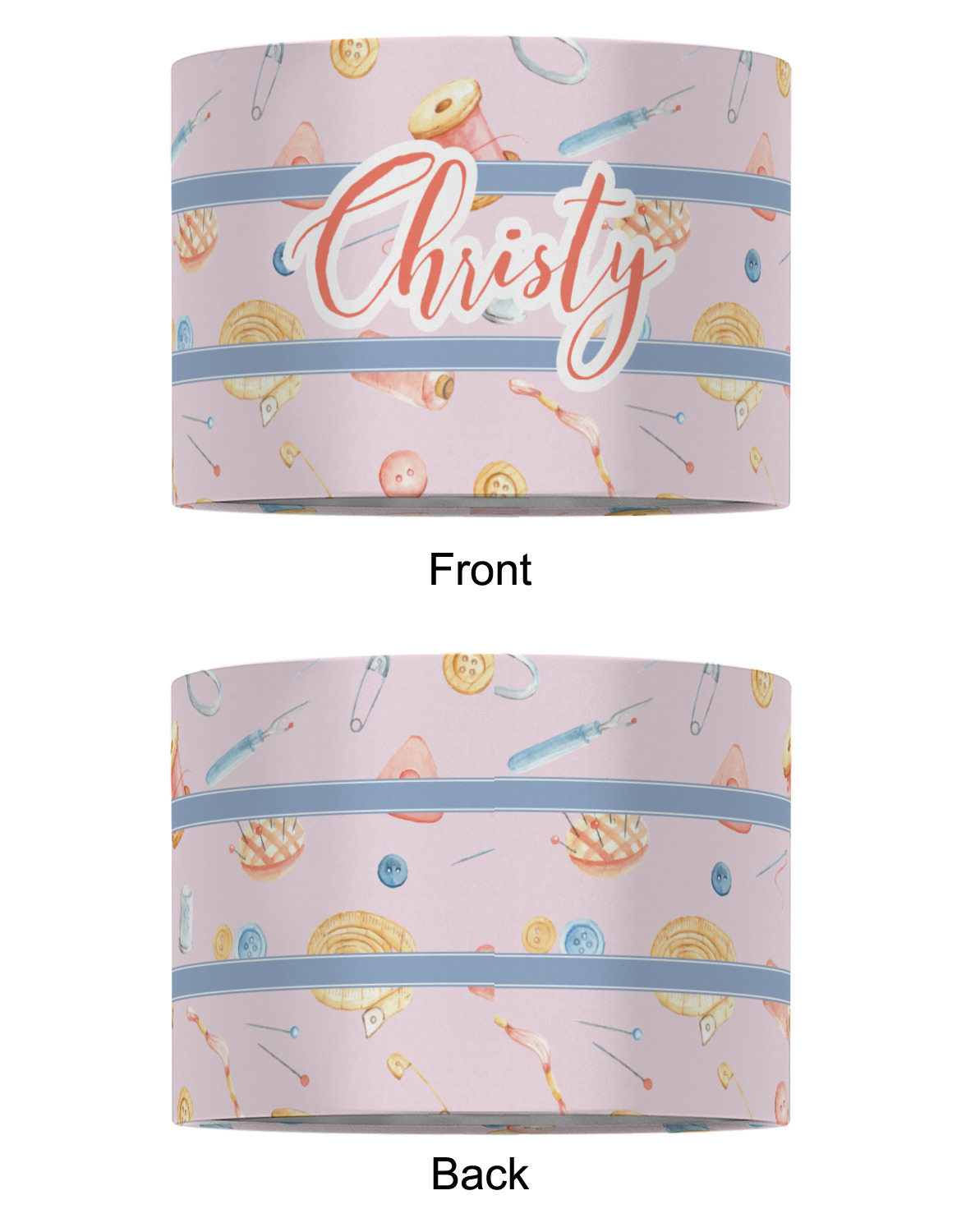 The design has a single pattern with a light pink background. The pattern is filled with sewing objects from needles to spools to pin cushions. The colors of the sewing objects include grey, light blue, peach, pink, and yellow. There are two ribbons going across the design that are a light grey-blue, accenting the similar color in the pattern. In between the two ribbons is where your personalization goes! On the coordinating design a textured grey-blue background is used, while a fun graphic of a pile of sewing items sits in the middle. Your personalization goes underneath.