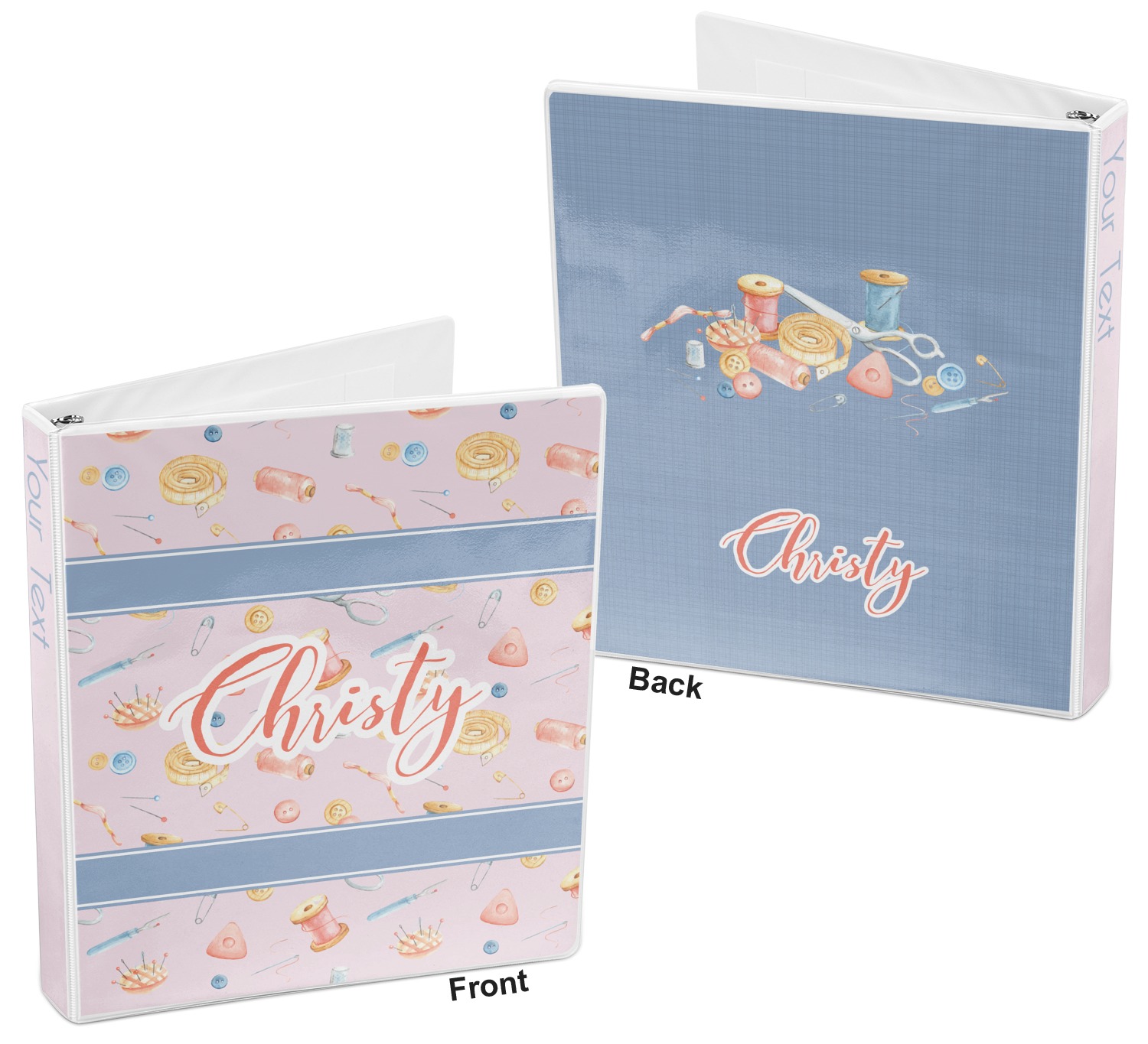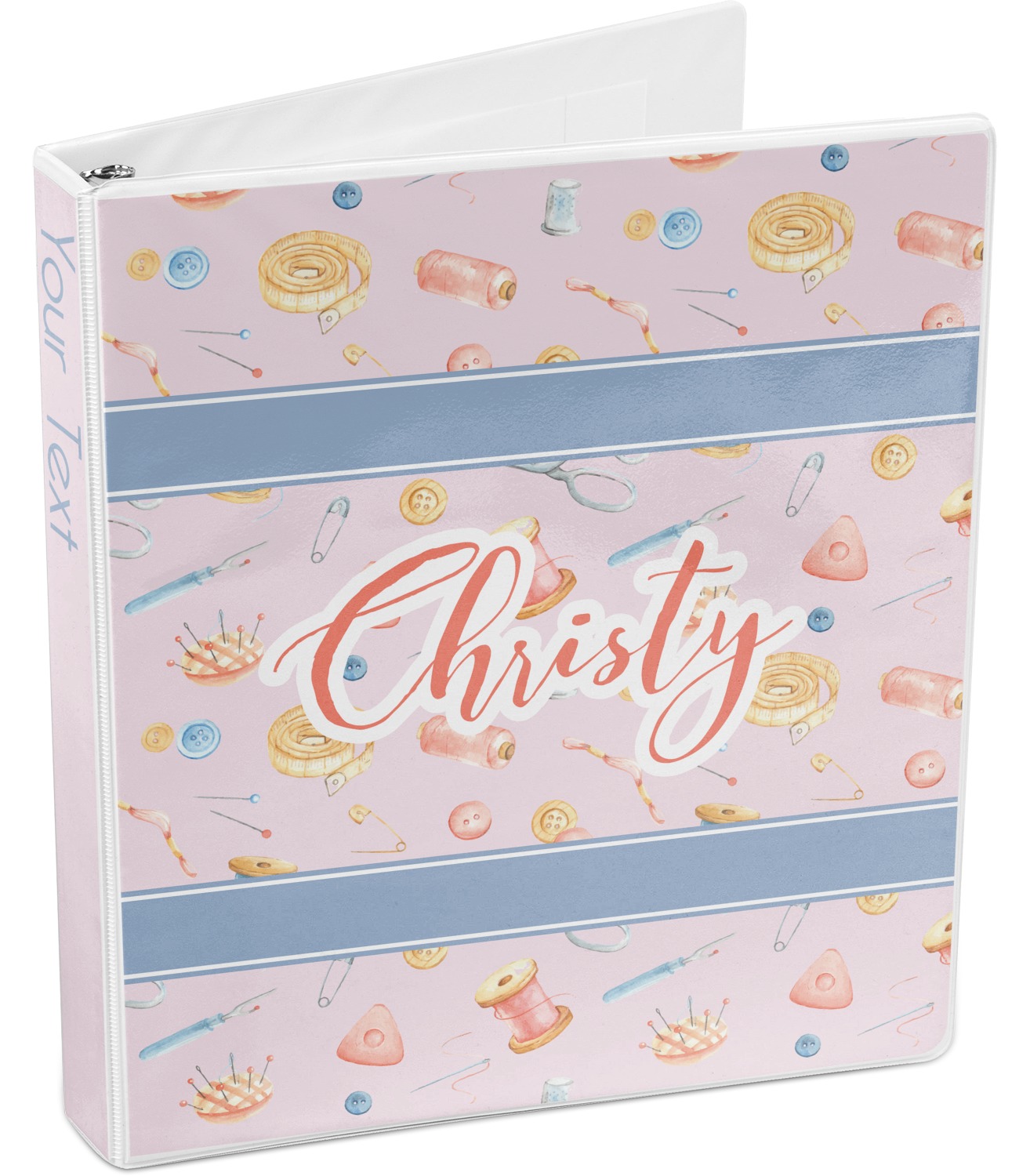 The design has a single pattern with a light pink background. The pattern is filled with sewing objects from needles to spools to pin cushions. The colors of the sewing objects include grey, light blue, peach, pink, and yellow. There are two ribbons going across the design that are a light grey-blue, accenting the similar color in the pattern. In between the two ribbons is where your personalization goes! On the coordinating design a textured grey-blue background is used, while a fun graphic of a pile of sewing items sits in the middle. Your personalization goes underneath.