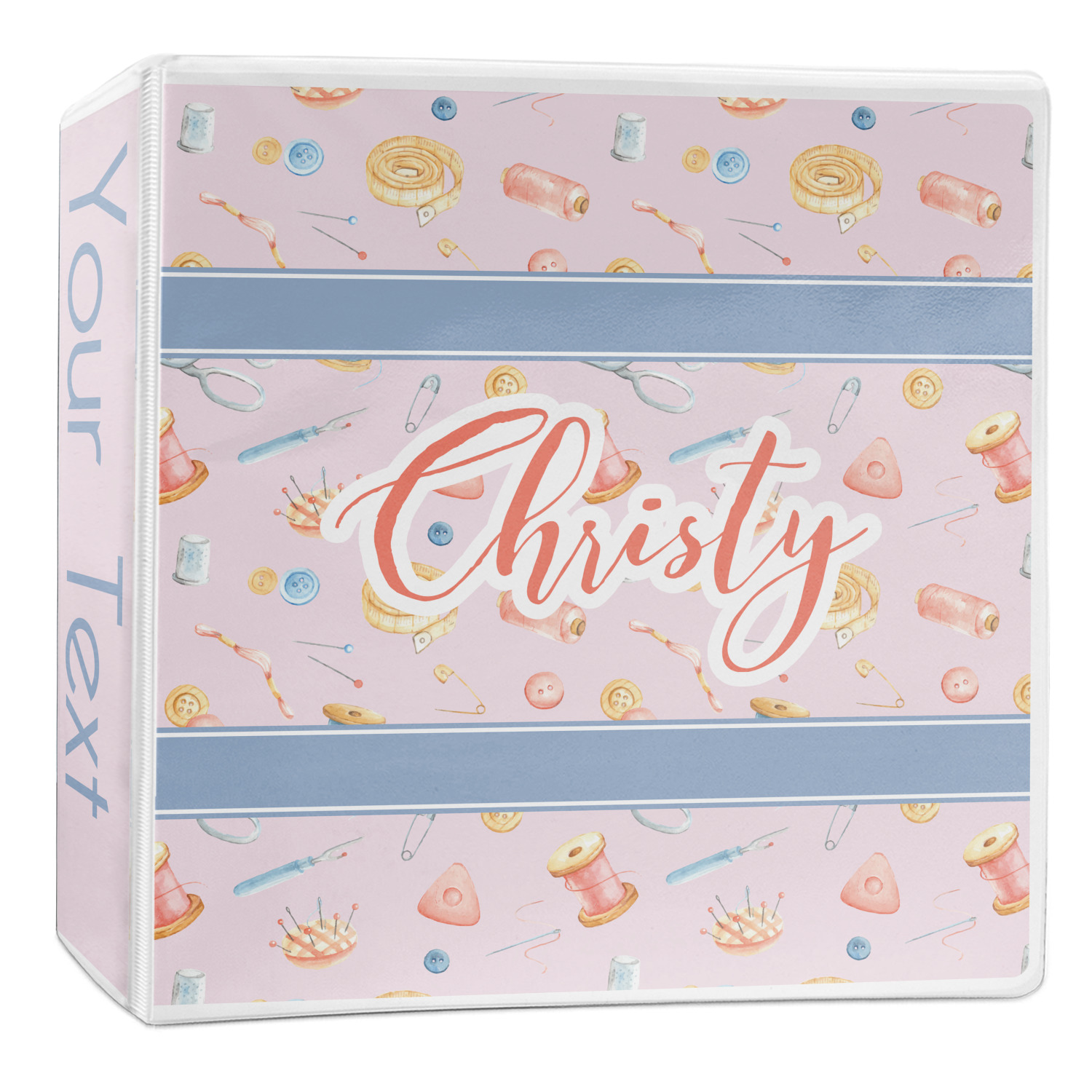 The design has a single pattern with a light pink background. The pattern is filled with sewing objects from needles to spools to pin cushions. The colors of the sewing objects include grey, light blue, peach, pink, and yellow. There are two ribbons going across the design that are a light grey-blue, accenting the similar color in the pattern. In between the two ribbons is where your personalization goes! On the coordinating design a textured grey-blue background is used, while a fun graphic of a pile of sewing items sits in the middle. Your personalization goes underneath.