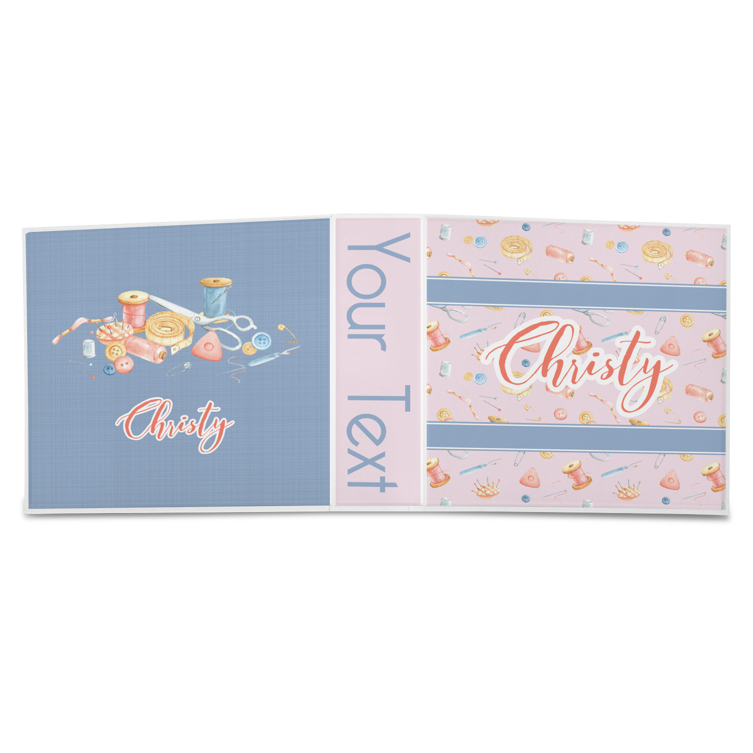 The design has a single pattern with a light pink background. The pattern is filled with sewing objects from needles to spools to pin cushions. The colors of the sewing objects include grey, light blue, peach, pink, and yellow. There are two ribbons going across the design that are a light grey-blue, accenting the similar color in the pattern. In between the two ribbons is where your personalization goes! On the coordinating design a textured grey-blue background is used, while a fun graphic of a pile of sewing items sits in the middle. Your personalization goes underneath.