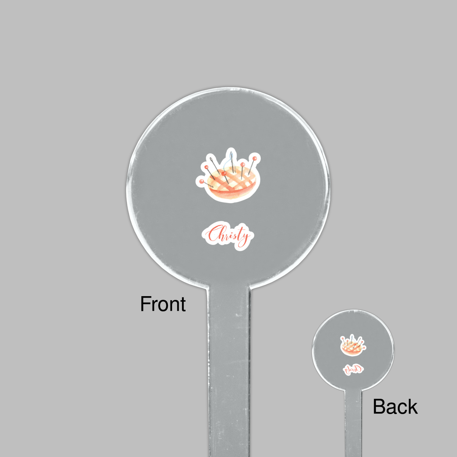 The design has a single pattern with a light pink background. The pattern is filled with sewing objects from needles to spools to pin cushions. The colors of the sewing objects include grey, light blue, peach, pink, and yellow. There are two ribbons going across the design that are a light grey-blue, accenting the similar color in the pattern. In between the two ribbons is where your personalization goes! On the coordinating design a textured grey-blue background is used, while a fun graphic of a pile of sewing items sits in the middle. Your personalization goes underneath.