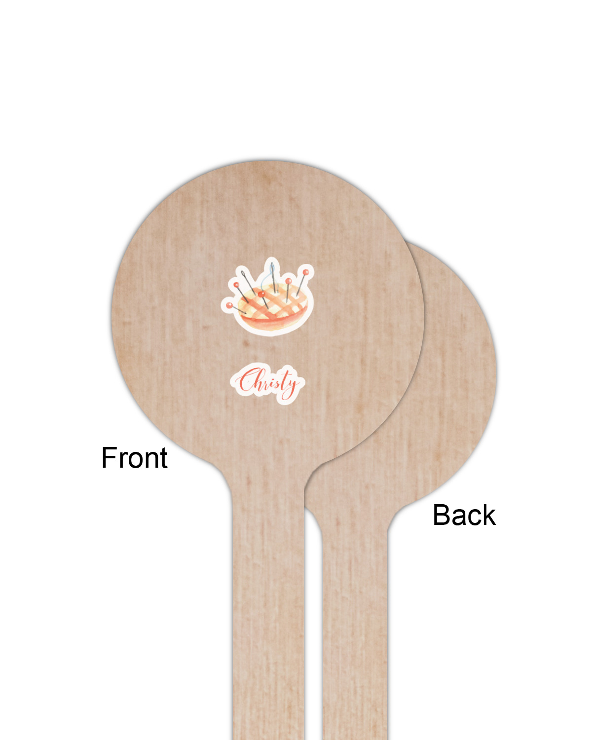 The design has a single pattern with a light pink background. The pattern is filled with sewing objects from needles to spools to pin cushions. The colors of the sewing objects include grey, light blue, peach, pink, and yellow. There are two ribbons going across the design that are a light grey-blue, accenting the similar color in the pattern. In between the two ribbons is where your personalization goes! On the coordinating design a textured grey-blue background is used, while a fun graphic of a pile of sewing items sits in the middle. Your personalization goes underneath.