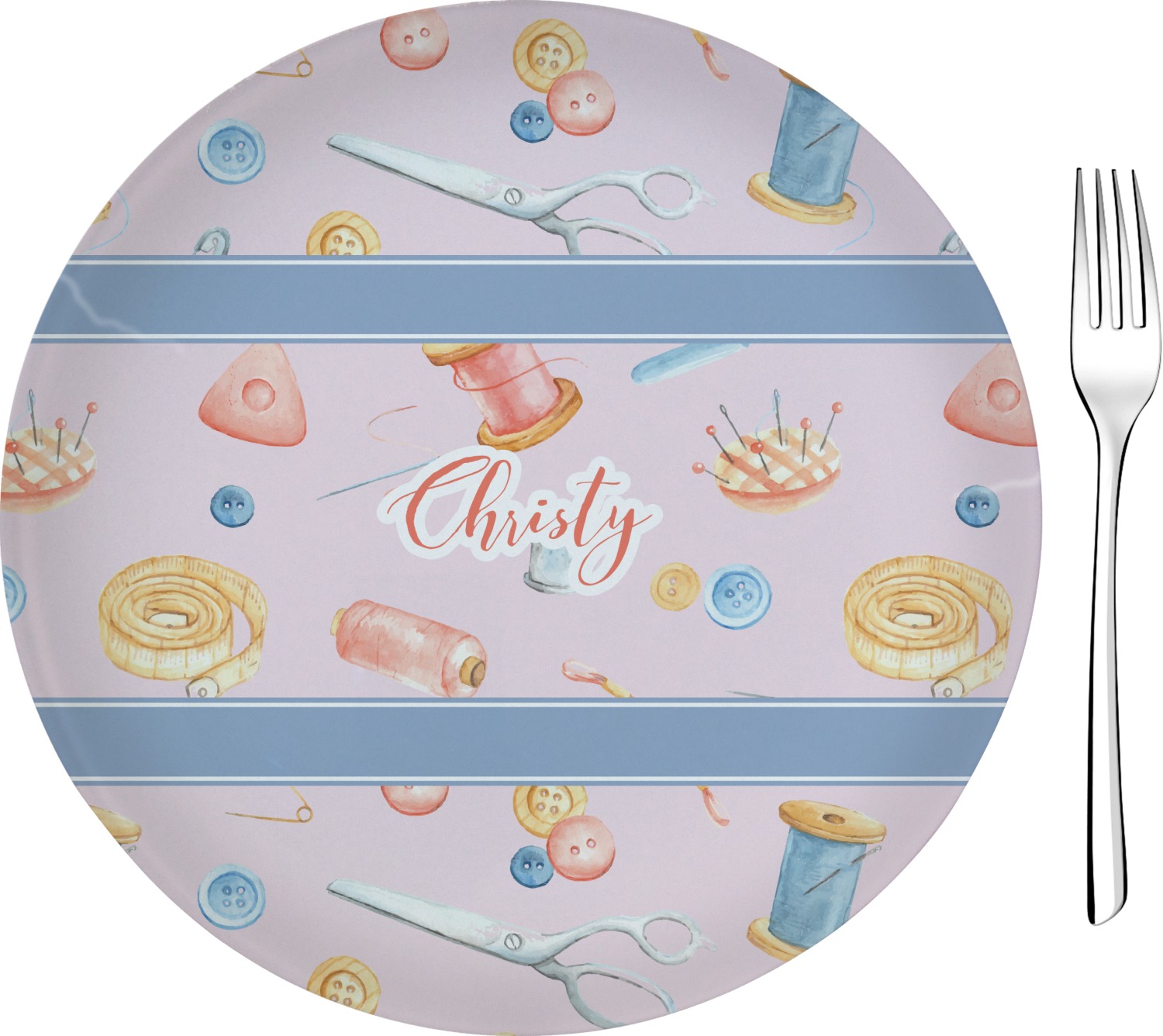 The design has a single pattern with a light pink background. The pattern is filled with sewing objects from needles to spools to pin cushions. The colors of the sewing objects include grey, light blue, peach, pink, and yellow. There are two ribbons going across the design that are a light grey-blue, accenting the similar color in the pattern. In between the two ribbons is where your personalization goes! On the coordinating design a textured grey-blue background is used, while a fun graphic of a pile of sewing items sits in the middle. Your personalization goes underneath.