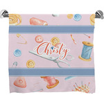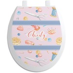 The design has a single pattern with a light pink background. The pattern is filled with sewing objects from needles to spools to pin cushions. The colors of the sewing objects include grey, light blue, peach, pink, and yellow. There are two ribbons going across the design that are a light grey-blue, accenting the similar color in the pattern. In between the two ribbons is where your personalization goes! On the coordinating design a textured grey-blue background is used, while a fun graphic of a pile of sewing items sits in the middle. Your personalization goes underneath.