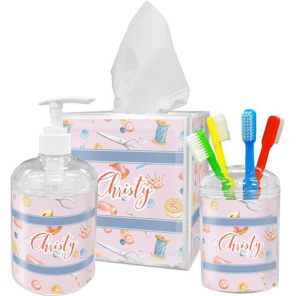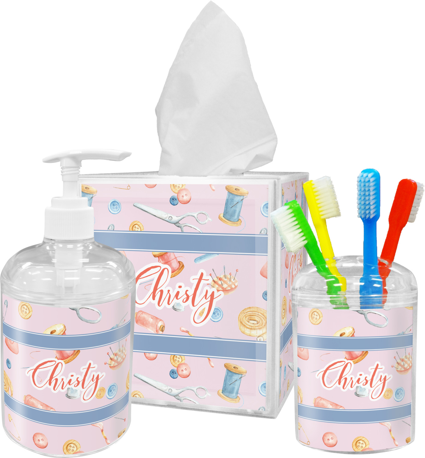 Your bathroom accessories set includes a tissue box cover, a toothbrush holder, and an acrylic soap dispenser. When purchased together, you can make a coordinating set, and save money, as the set is cheaper than purchasing each item individually.