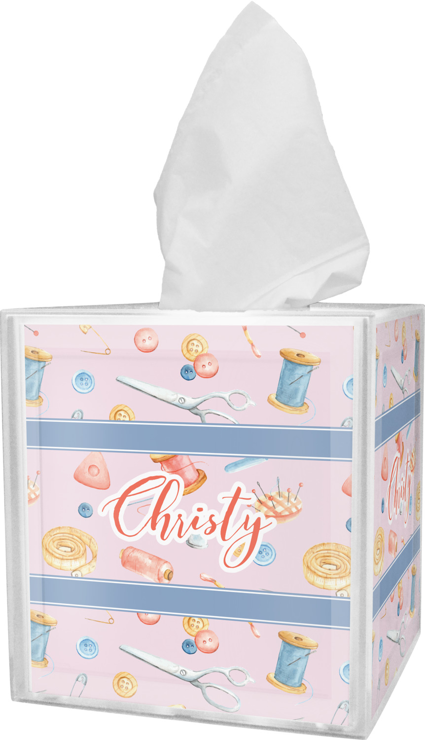 These tissue holders are built from durable acrylic and display your unique personalization on fine-quality vinyl inserts placed within the four sides and top. The box features two pieces, allowing you to easily switch out tissue boxes. On the sides, you'll find ridges that ensure the top and base fit securely in place. The bottom of these tissue box holders has four, rubber, non-slip pads to prevent the box from scuffing any surface you decide to display it on. Each box can fit a standard 5-by-5-inch box of tissues.