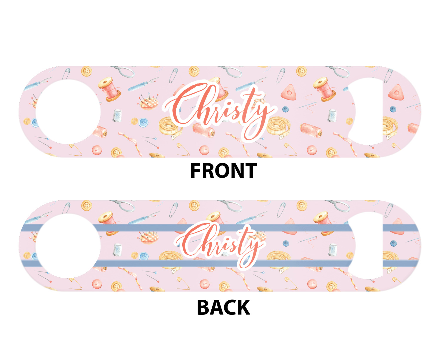 Made from stainless steel, these beer bottle openers are 7 by 1.625 inches, giving you plenty of leverage when trying to open a stubborn bottle. On one end of this personalized bottle opener, you'll find a circular hole for you to hang and display your opener. On the opposite end, you'll find the tool used for opening bottles. This opener in particular has the same structure and style as professional bartender bottle openers. Your customization is sublimated onto both the back and front, and both sides can be customized individually. Choose from one of our two base colors - white or silver.