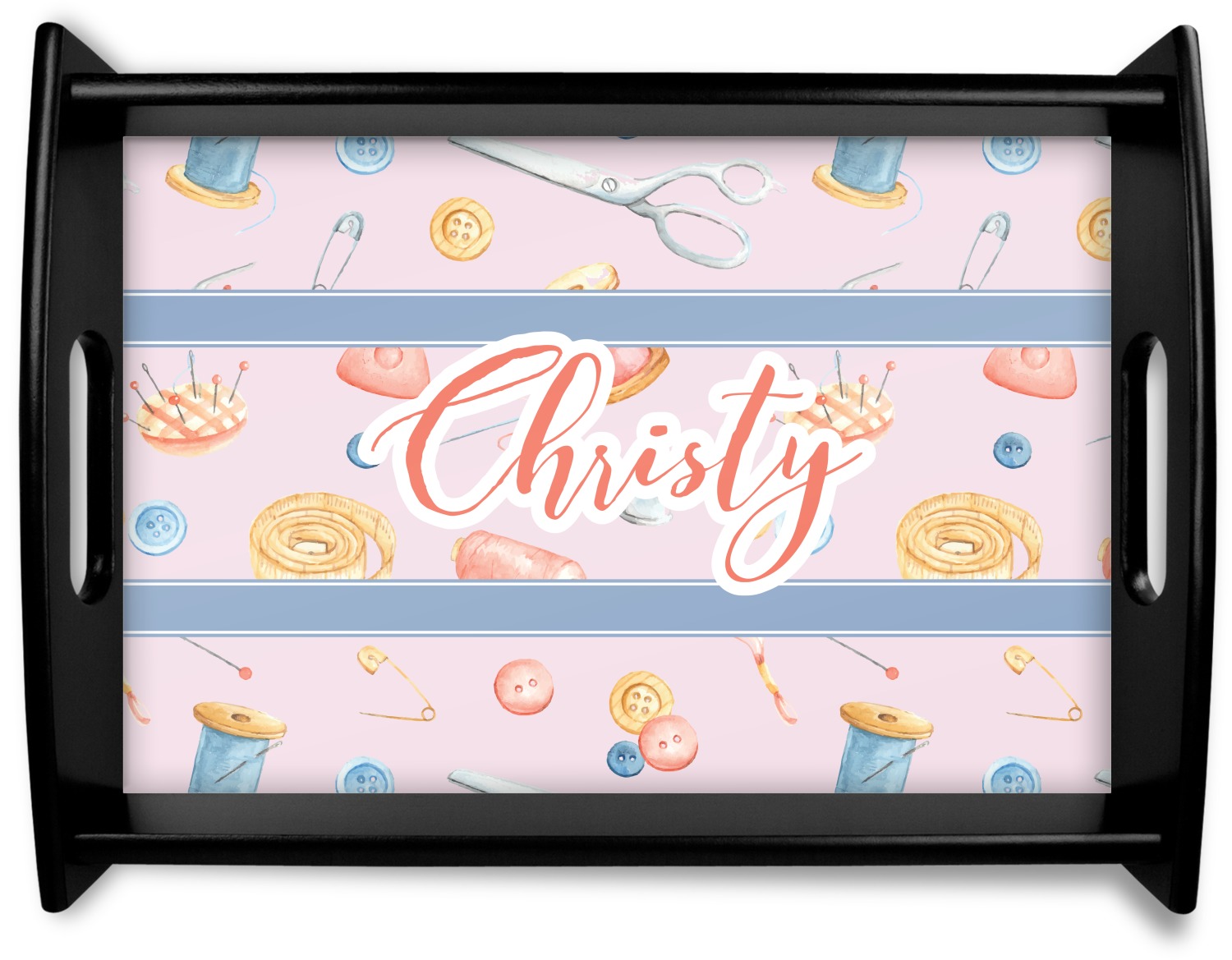 This serving tray with handles features square edges and two rounded sides, creating a very modern look. Each side is fabricated from a beautifully cut, natural wood. The bottom of the interior of the tray displays your customized design in bright, vibrant color. The tray is sold in both a black color and a natural wood look. Each variation of the wood serving tray has two sizes: Small, which is 14" x 10" x 2.25", and Large, which is 19.5" x 13.5" x 2.75".