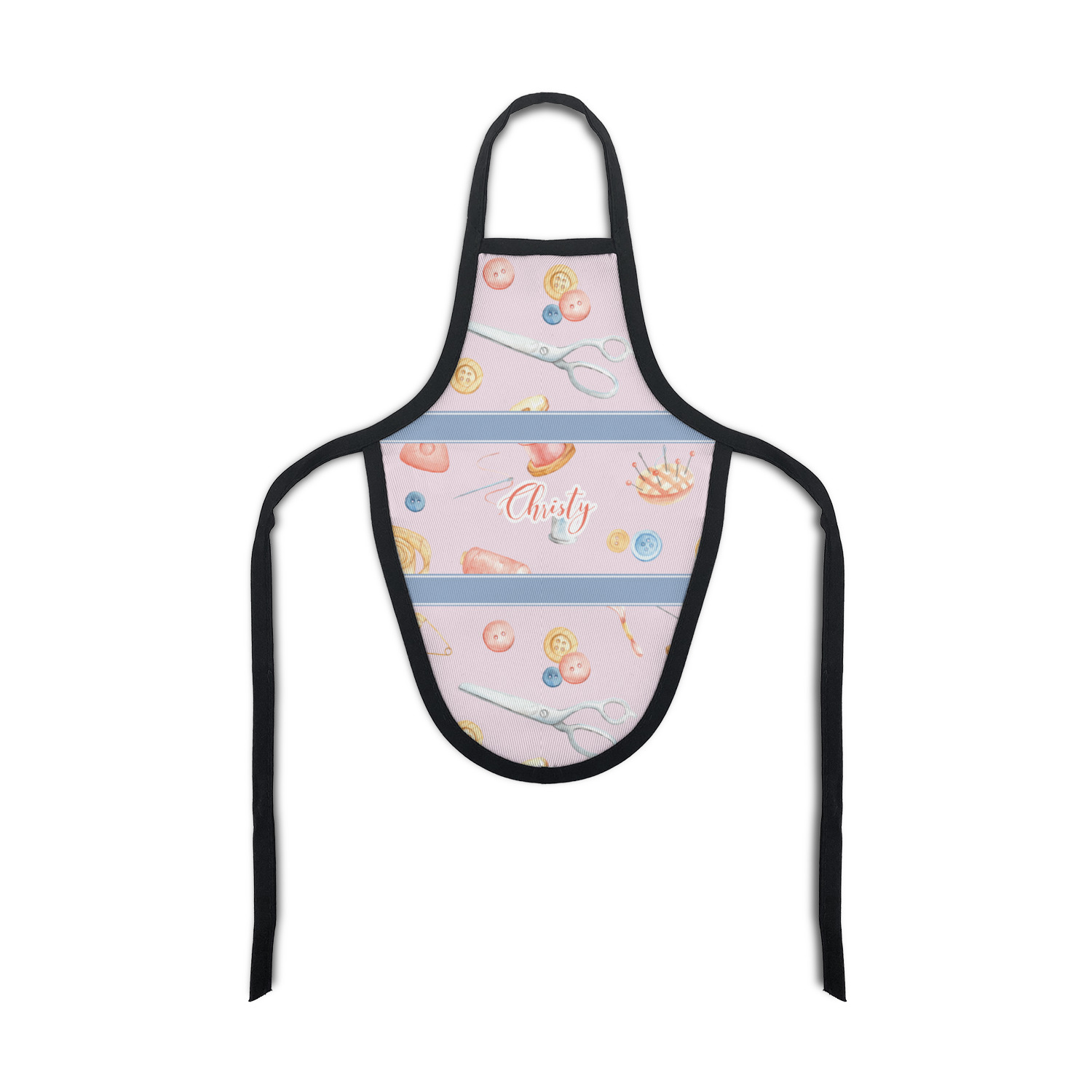The design has a single pattern with a light pink background. The pattern is filled with sewing objects from needles to spools to pin cushions. The colors of the sewing objects include grey, light blue, peach, pink, and yellow. There are two ribbons going across the design that are a light grey-blue, accenting the similar color in the pattern. In between the two ribbons is where your personalization goes! On the coordinating design a textured grey-blue background is used, while a fun graphic of a pile of sewing items sits in the middle. Your personalization goes underneath.